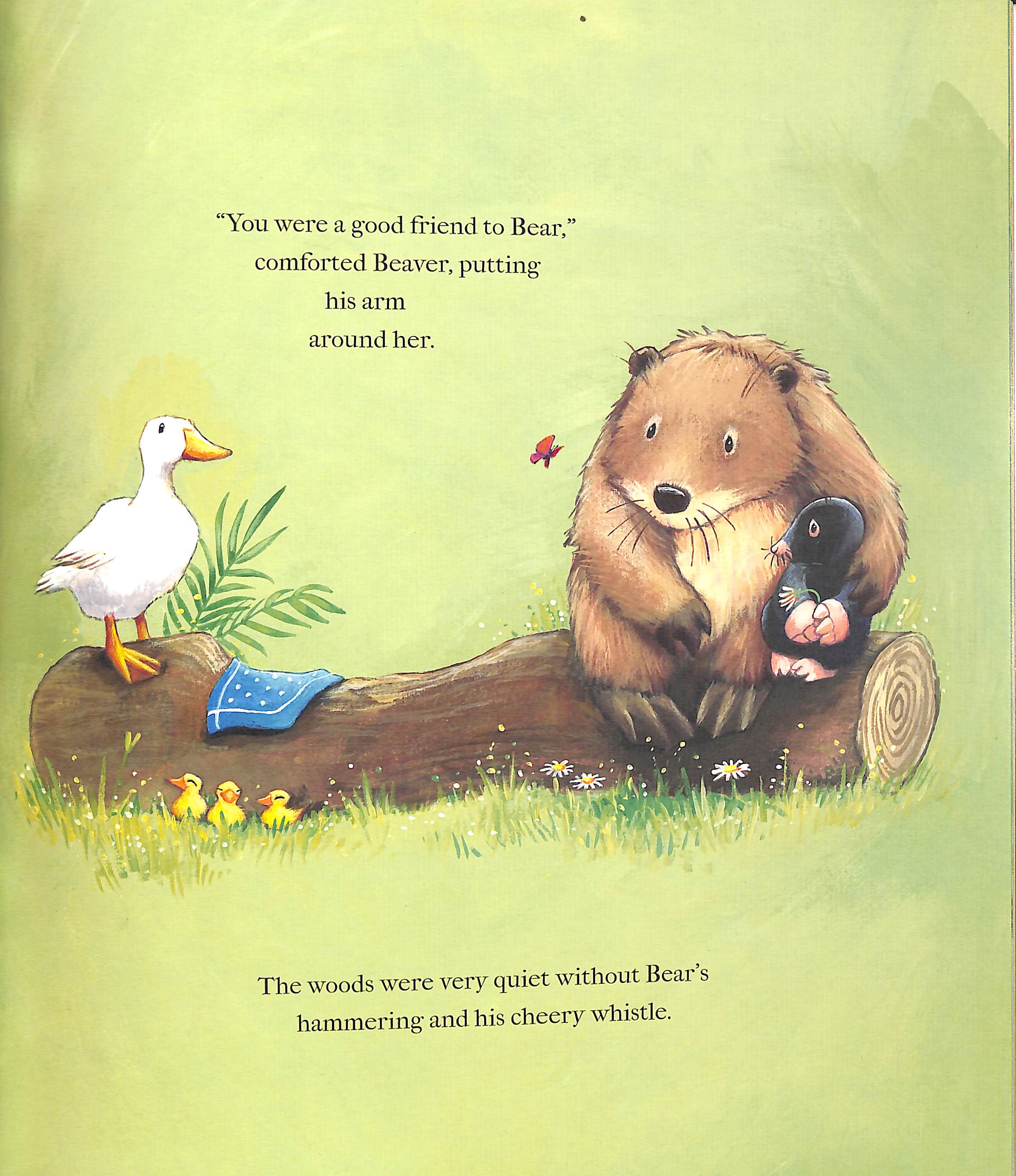A heartfelt story, deftly written and beautifully illustrated by the inimitable Jane Chapman. "I miss Bear." sniffed Mole, "but I know he wouldn't want us to be sad." "How can we feel happy?" puzzled Beaver. "Everything is different now."Bear died on a Friday, as sun speckled the grass and caterpillars nibbled the leaves.