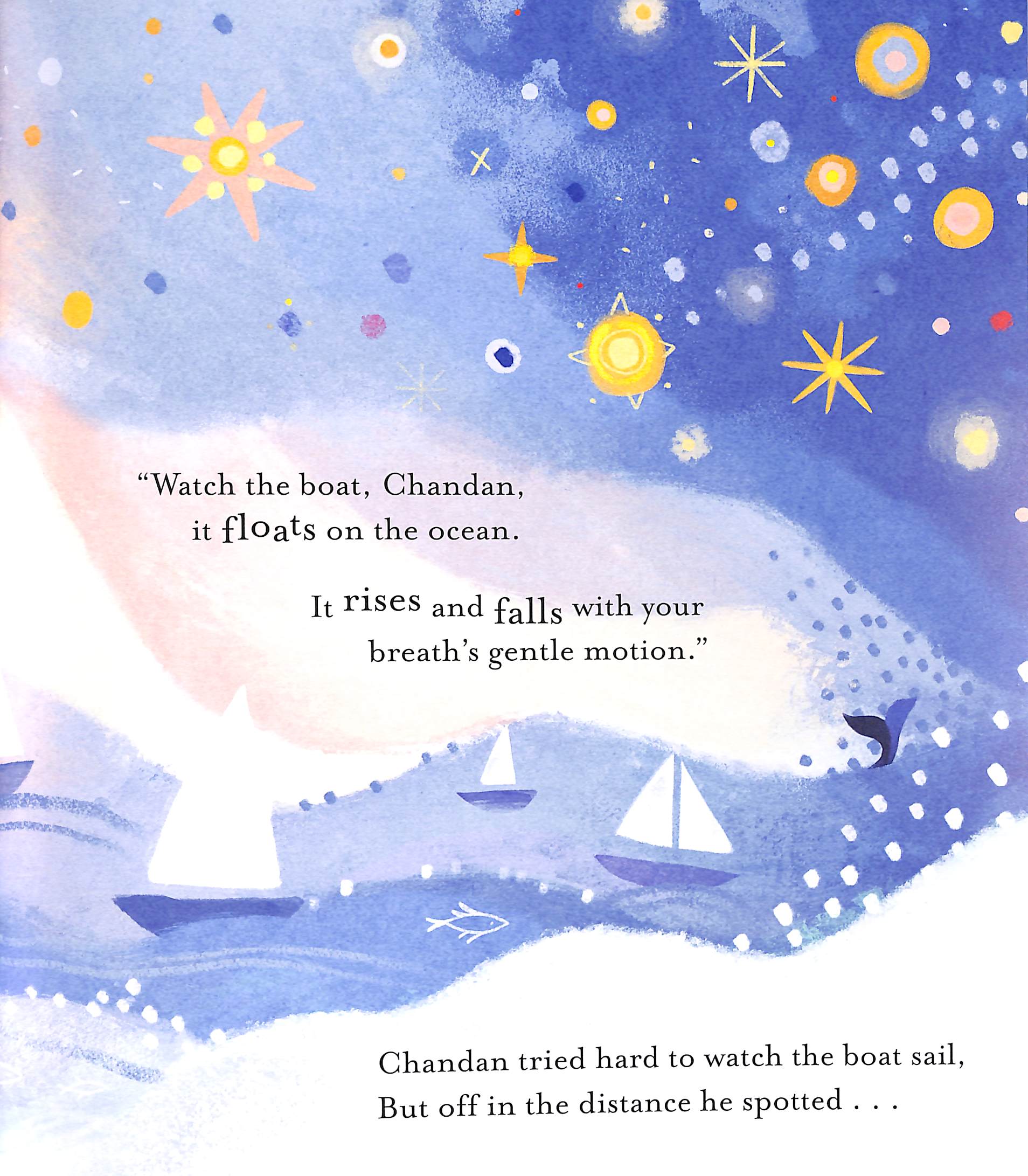 Shortlisted for Children’s Wellbeing Book of the Year at the Week Junior Book Awards 2024. “Visually stunning, thoughtful and calming bedtime tale featuring tried-and-tested mindfulness techniques… The perfect way to ease little ones into the land of sleep” – Lancashire Evening Post A visually stunning, thoughtful and calming bedtime tale, featuring tried-and-tested mindfulness techniques. “Watch the boat, Chandan, it floats on the ocean.