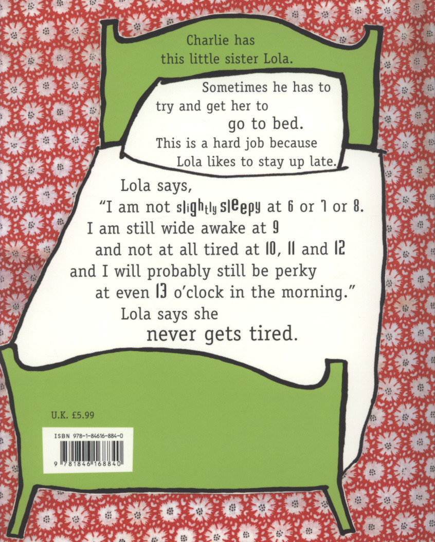 A classic Charlie and Lola picture book about tricky bedtimes from Children's Laureate Lauren Child. Charlie has this little sister Lola. Sometimes he has to try and get her off to bed. This is a hard job because Lola likes to stay up late...