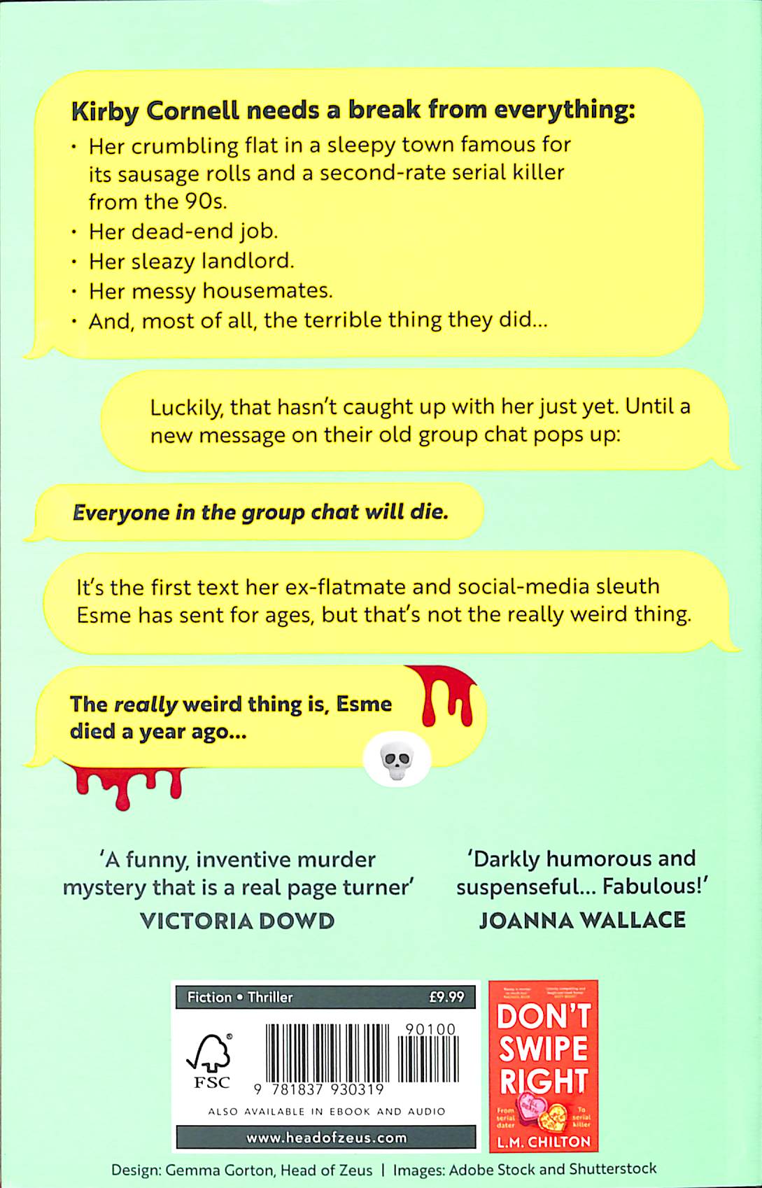'Funny, twisty, bloodthirsty' JULIE MAE COHEN 'An absolute joy of a thriller' SARAH BONNERKirby Cornell needs a break from everything:- Her crumbling flat in the sleepy town of Crowhurst (famous for its award-winning sausage rolls and a second-rate serial killer from the 90s). - Her dead-end job. - Her sleazy landlord. - Her slobbish housemates. - And, most of all, the terrible thing they did. Luckily, that hasn’t caught up with her just yet. Until a new message on their old group chat pops up:Everyone in the group chat will die. It’s the first text her ex-flatmate and social-media sleuth Esme has sent for ages, but that’s not the really weird thing.