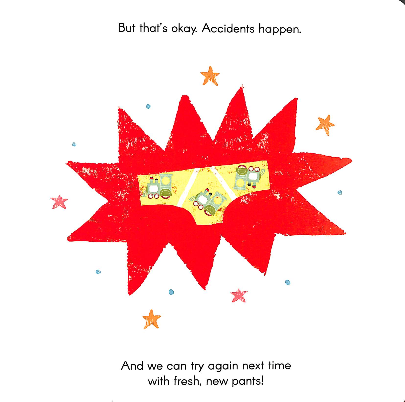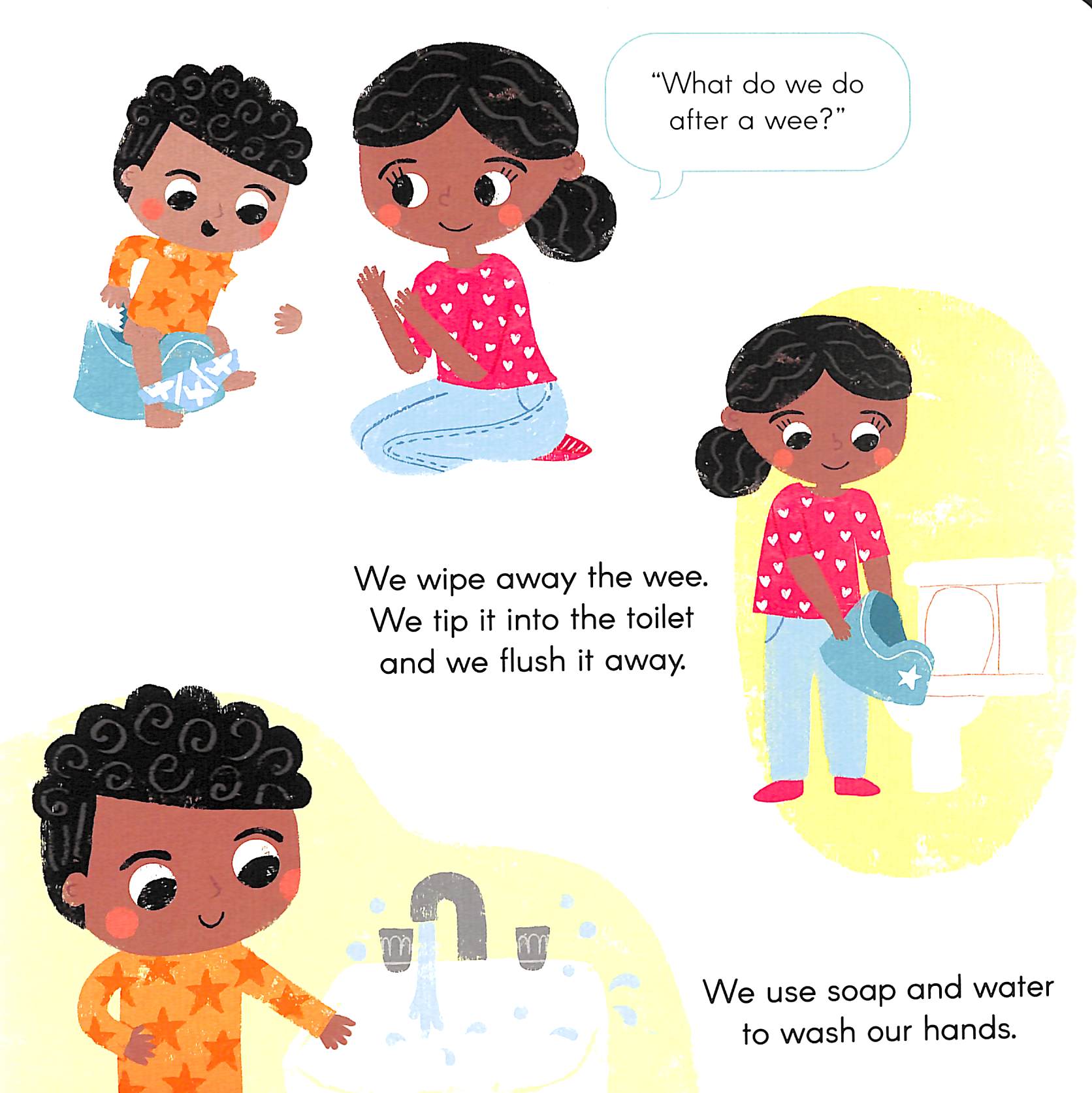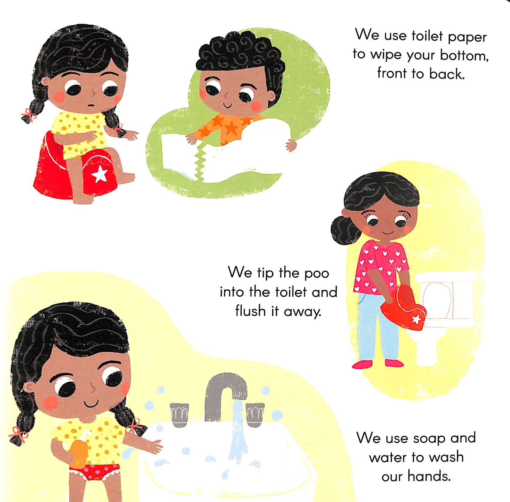 It teaches hygiene practices, positive reinforcement and a reminder that it is okay when accidents happen.