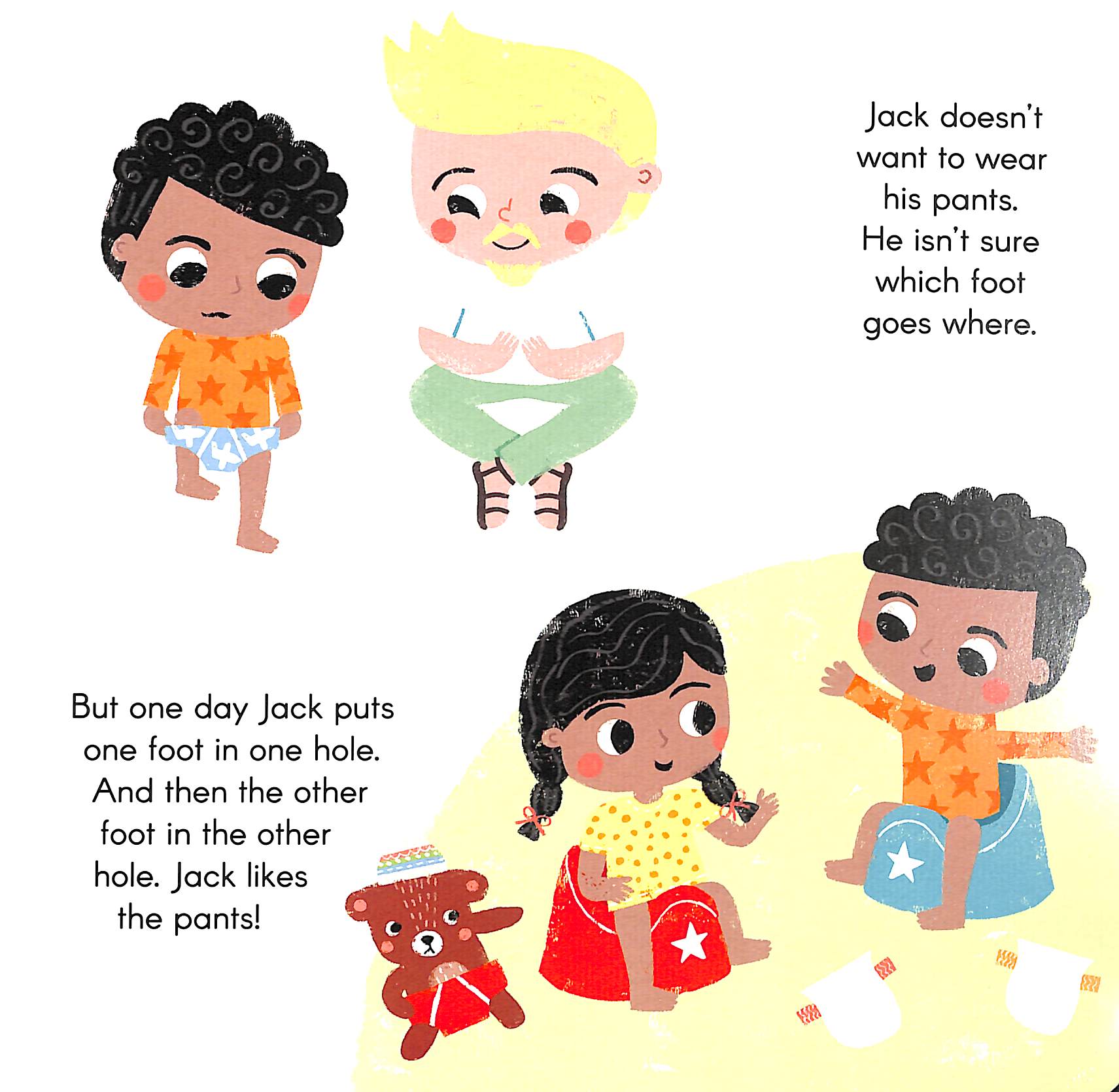 They each have pants, but Jack just puts his on Teddy while Jasmine uses her potty as a slide for her toys!