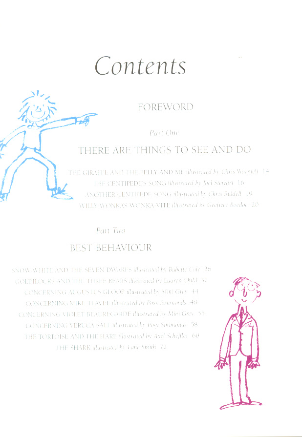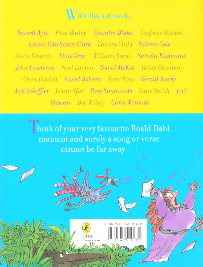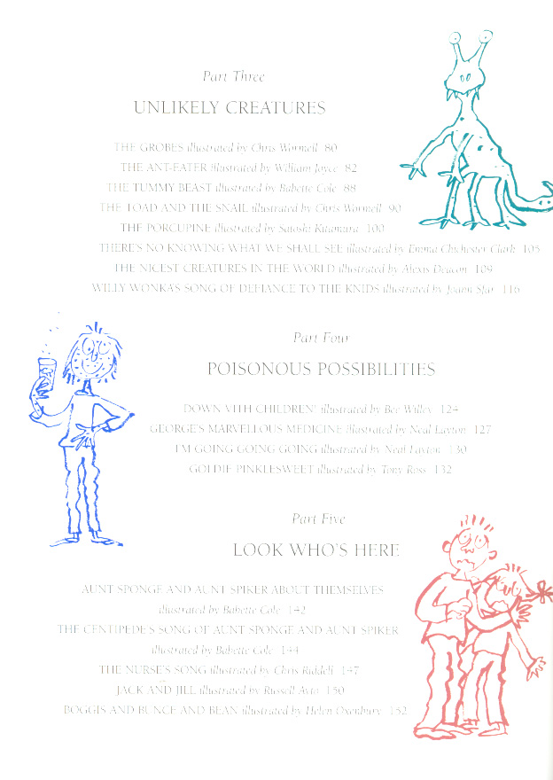 There are seven themed sections bursting with monsters, ghastly children, magical creatures, unpleasant adults and a few surprises. "Songs and Verse" is illustrated by Quentin Blake, as well as leading artists such as Babette Cole, Lauren Child, Chris Riddell and Tony Ross.