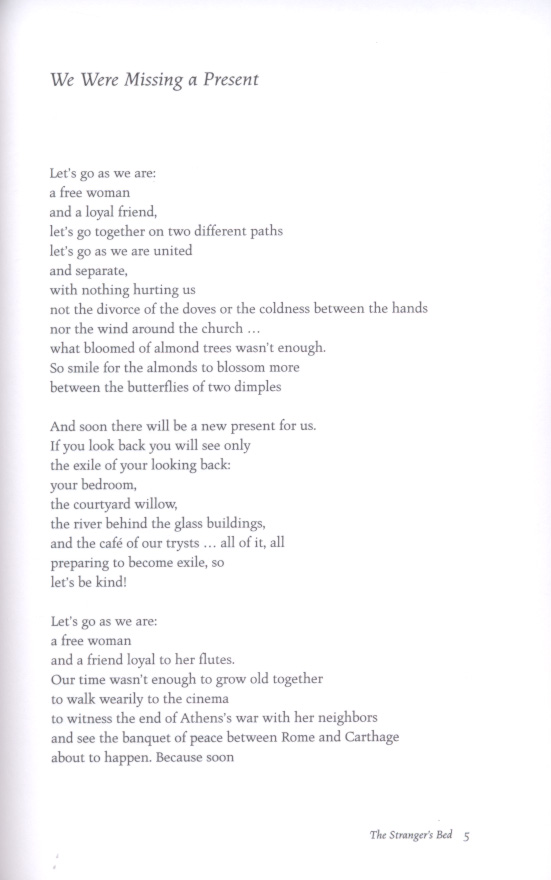Returning to Palestine in 1996, he settled in Ramallah, where he surprised his huge following in the Arab world by writing a book of love, "The Stranger's Bed" (1998), singing of love as a private exile, not about exile as a public love. "A State of Siege" (2002) was his response to the second Intifada, his testament not only to human suffering but to art under duress, art in transmutation.