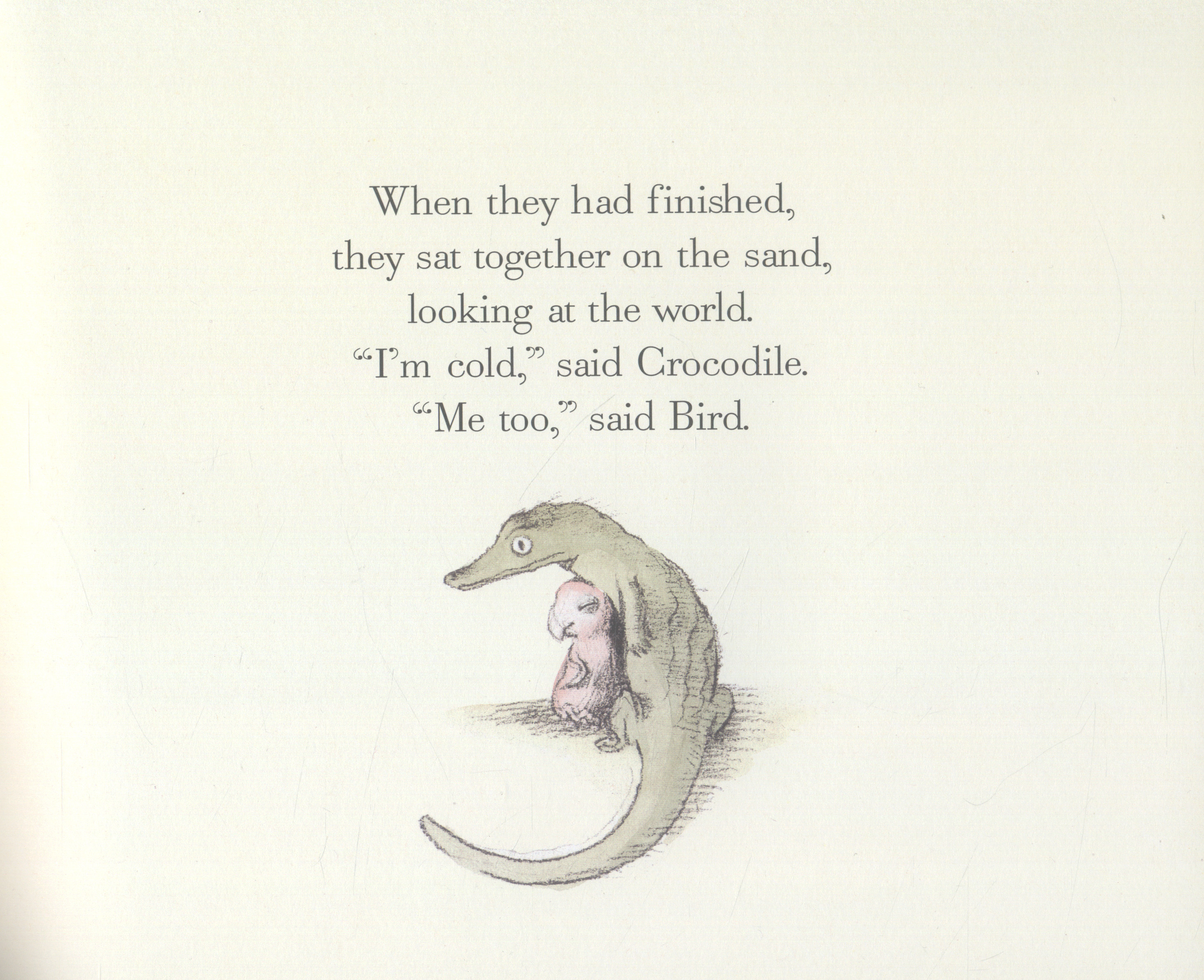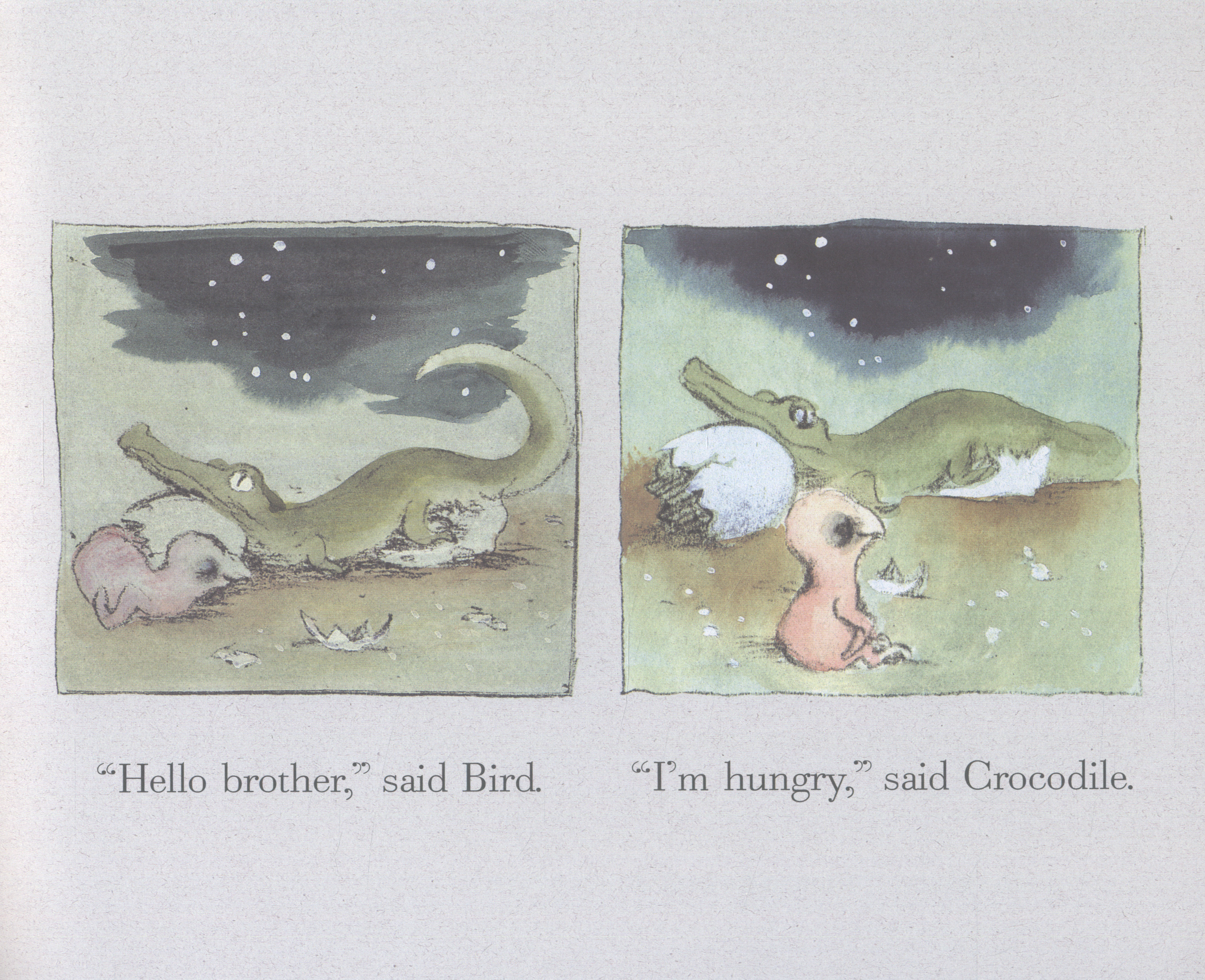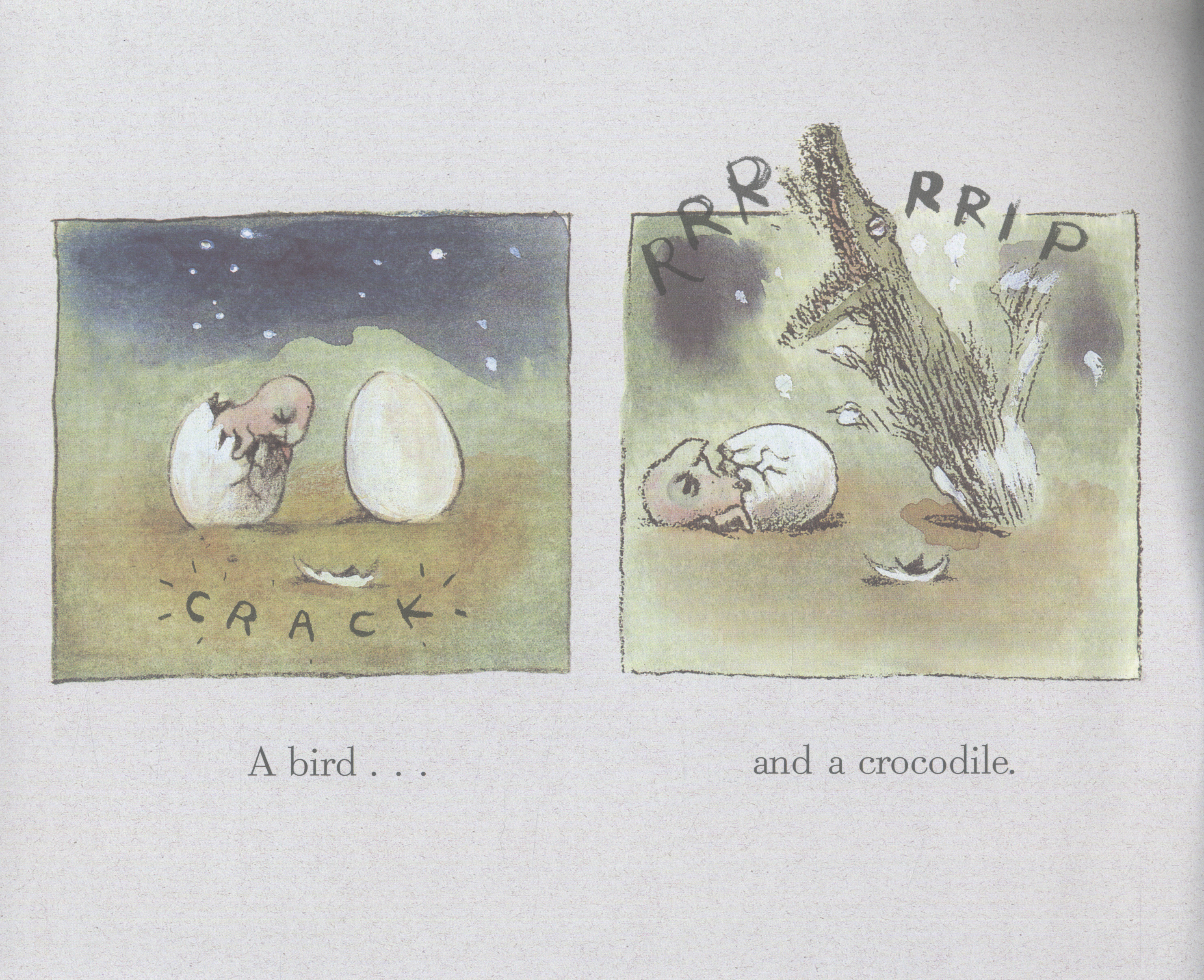 Side by side on the sand sat two eggs. With a crack and a rip, the brothers hatch, and out comes a bird and a...crocodile!