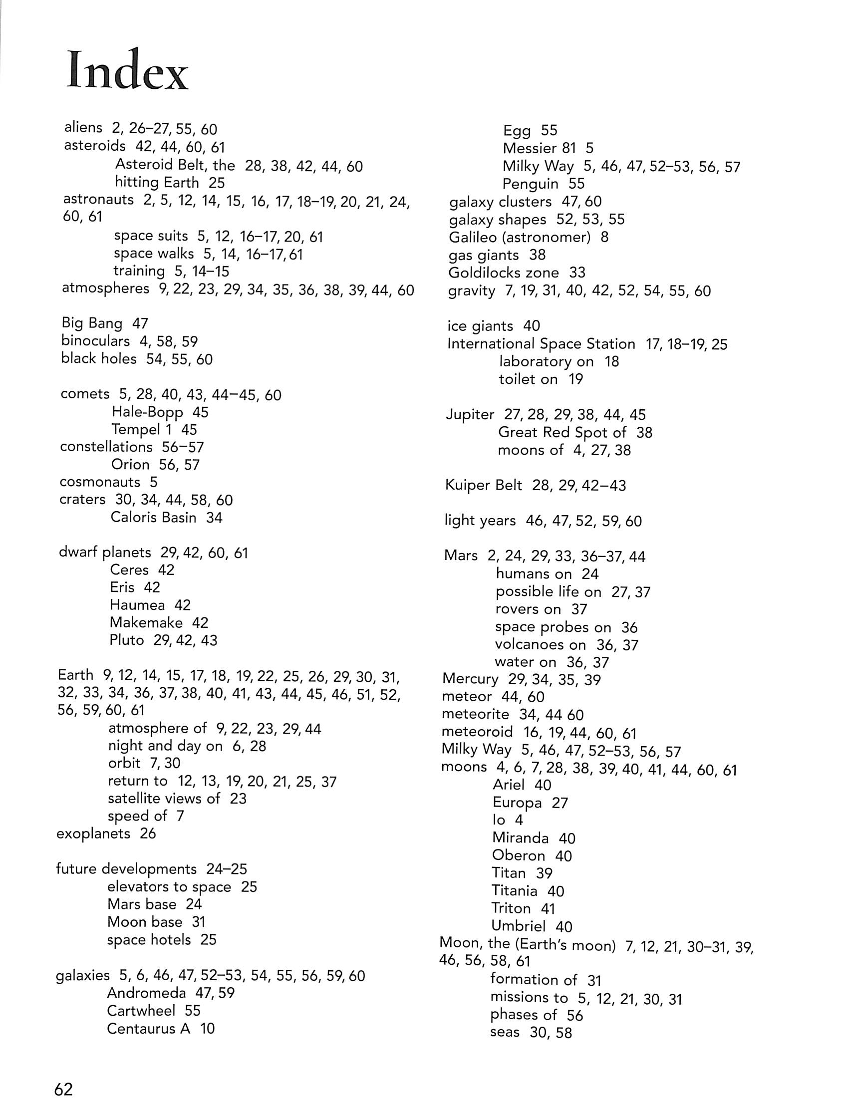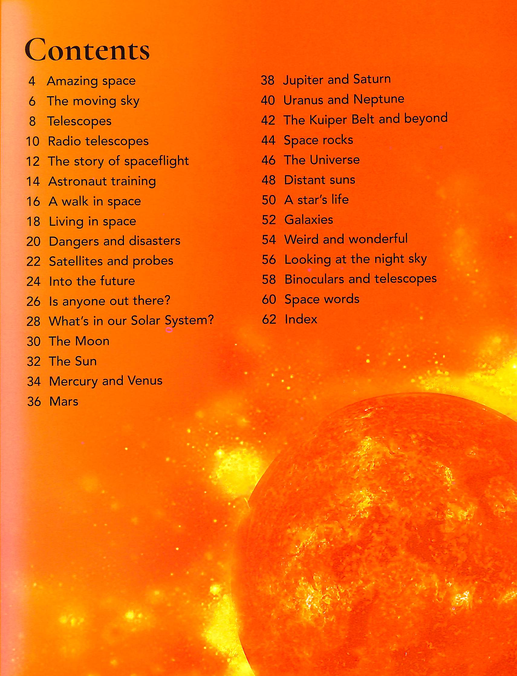 Provides simple explanations to questions such as "What are stars made of?" "Why does the Moon shine?" and "What do space toilets look like?" Includes internet links to carefully selected fun and informative websites. Chapters in this book include:- Amazing space- The moving sky- Telescopes- Radio telescopes- Trips into space- Astronaut training- A walk in space- Living in space- Dangers and disasters- Satellites and space probes- Into the future- Is anyone out there?- What's in our Solar System?- The Moon- The Sun- Mercury and Venus- Mars- Jupiter and Saturn- Uranus and Neptune- Pluto and beyond- Bits and pieces- The Universe- Distant suns- A star's life- Galaxies- Weird and wonderful- Looking at the night sky- Binoculars and telescopes- Space words