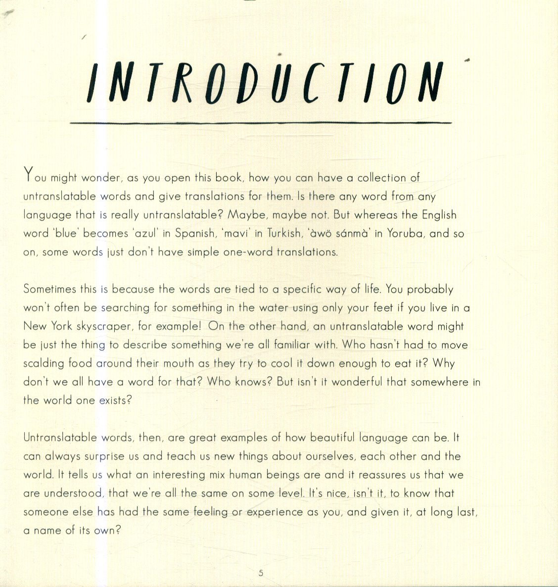 Did you know there was a special word for the distance a reindeer can travel before needing the toilet? Or for when you search for something in the water using only your feet?This hand-picked collection of untranslatable worlds from all over the world celebrates the magic of language, with gorgeous original artwork and fascinating facts about each word and the culture it comes from.