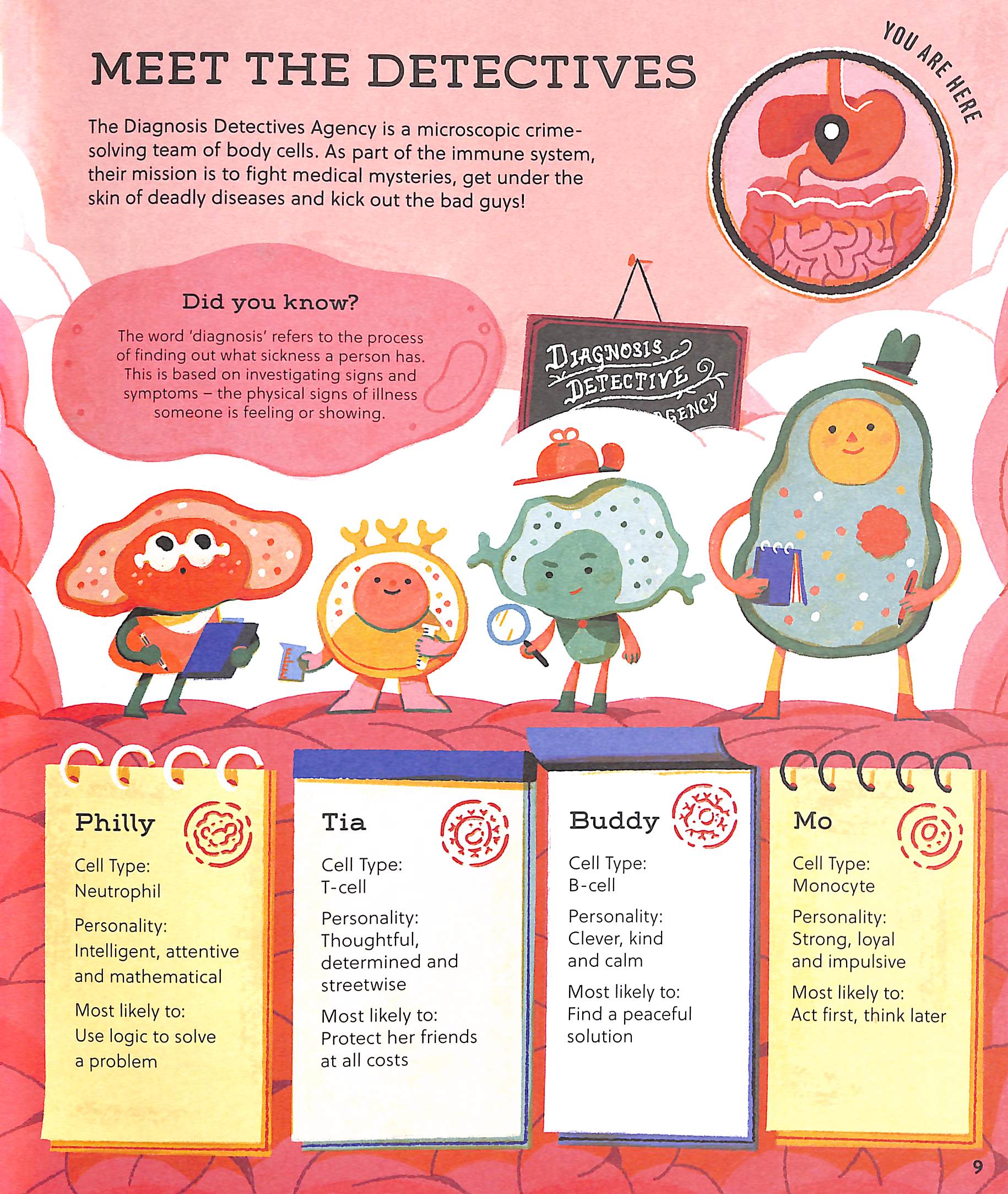 Join a team of quirky characters that live in the human body as they investigate the clues behind mystery symptoms to find each culprit to illnesses and ailments. The Diagnosis Detective Agency work out what's wrong inside their human body by investigating symptoms and inspecting suspects, before revealing the culprits causing tummy trouble.