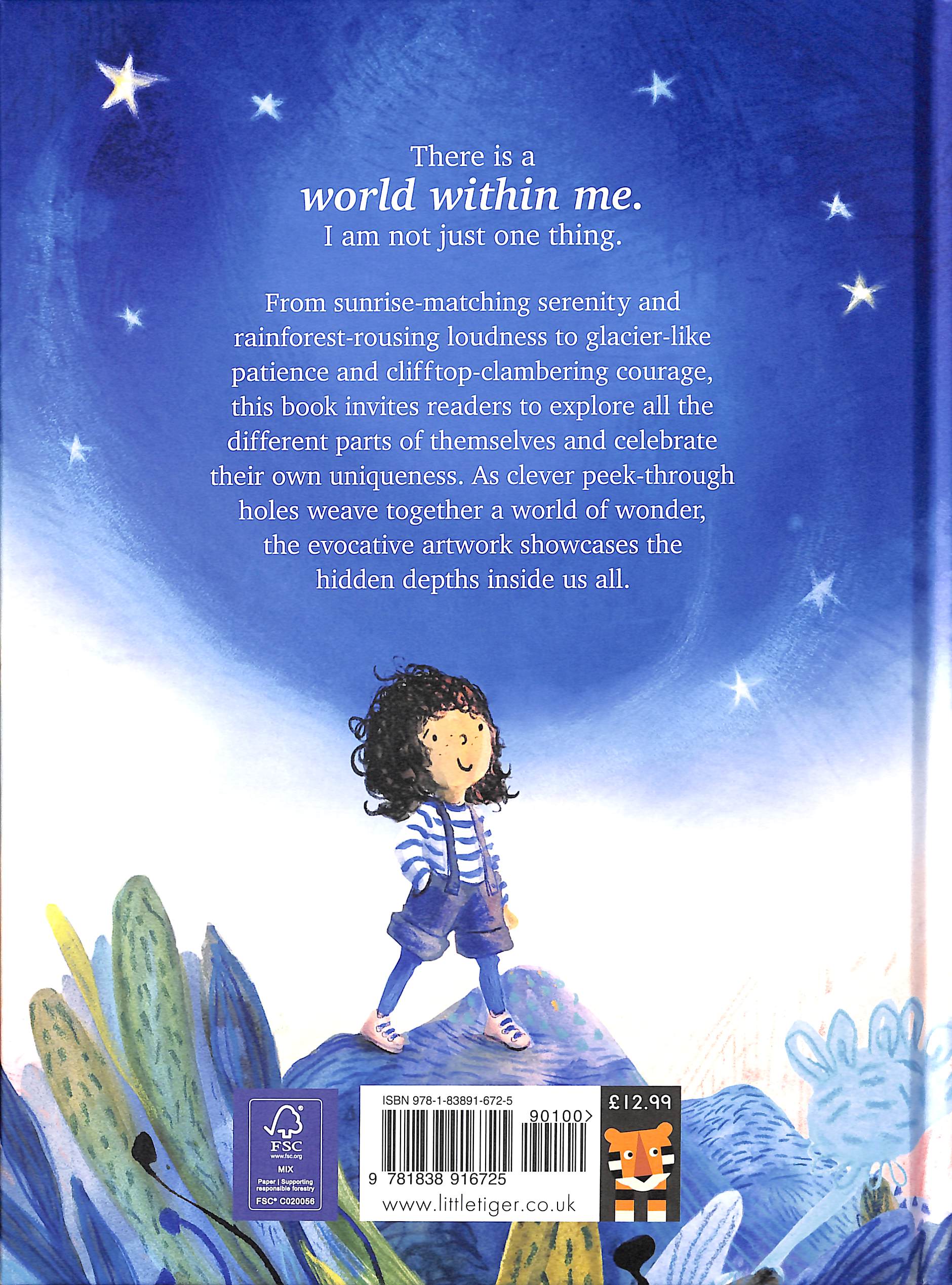 There is a world within me. I am not just one thing. From your sunrise-matching serenity and rainforest-rousing loudness to your glacier-like patience and clifftop-clambering courage, this book is a celebration of all the different facets that make you . . . YOU! With intricate peek-through holes, Anna Wilson's stunning illustrations conjure a cosmos that reflects all the amazing and varied parts of your personality. Embark on a journey through the landscapes inside yourself.