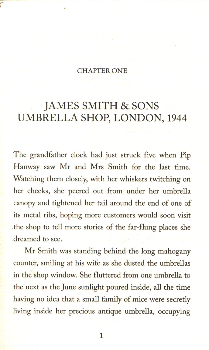 A timeless tale of courage, resistance and friendship, The Umbrella Mouse is a heart-stopping adventure drawing on the true stories of animals caught in the conflict of WWII, winner of the 2019 Sainsbury's Book Prize for Fiction and selected for Waterstones Book of the Month. 1944, and London is under attack. Young mouse Pip Hanway's safe and quiet world is turned upside down when her home, umbrella shop James Smith & Sons, is destroyed by a bomb. Orphaned and alone, she must begin a perilous quest to find a new home. But the only way to get there is by joining Noah’s Ark, a secret gang of animals fighting with the resistance in France, operating beneath the feet of the human soldiers.