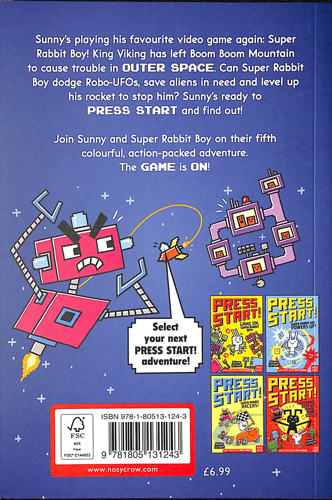 For 5+ kids who love video games but aren't allowed to play as often as they'd like... Sunny's favourite game is Super Rabbit Boy, where his carrot-loving friend must thwart all the plots the evil King Viking of Boom Boom Mountain comes up with. Help! King Viking is causing trouble in outer space! It's up to Super Rabbit Boy to stop him. But with a weak and slow Level 1 rocket, it won't be easy to stop the army of space robots or find King Viking. Can Super Rabbit Boy dodge Robo-UFOs, save aliens and level up his rocket to beat King Viking? Or will King Viking's Level 10 rocket send him blasting off into space?
