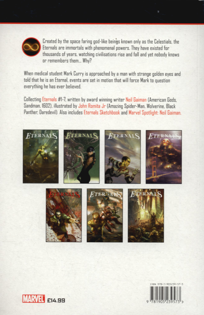Written by bestselling cult author Neil Gaiman. Collects Eternals Vol.1 #1-7, plus Eternal Sketchbook and Marvel Spotlight.