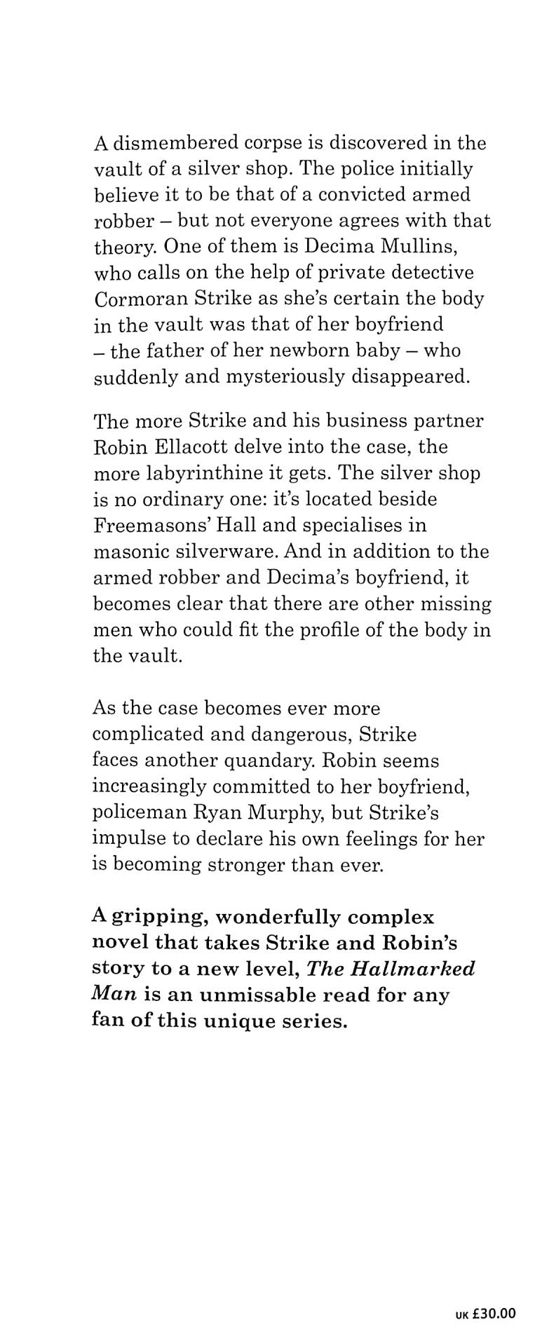 Robin seems increasingly committed to her boyfriend, policeman Ryan Murphy, but the impulse to declare his own feelings for her is becoming stronger than ever. A gripping, wonderfully complex novel which takes Strike and Robin's story to a new level, The Hallmarked Man is an unmissable read for any fan of this unique series. PRAISE FOR THE CORMORAN STRIKE SERIES'A superlative piece of crime fiction' Sunday Times'The work of a master storyteller' Daily Telegraph'A scrupulous plotter and master of misdirection, Galbraith keeps the pages turning . . . Strike and Ellacott remain one of crime's most engaging duos' Guardian'No one can deny [Robert Galbraith, pseudonym of] J.