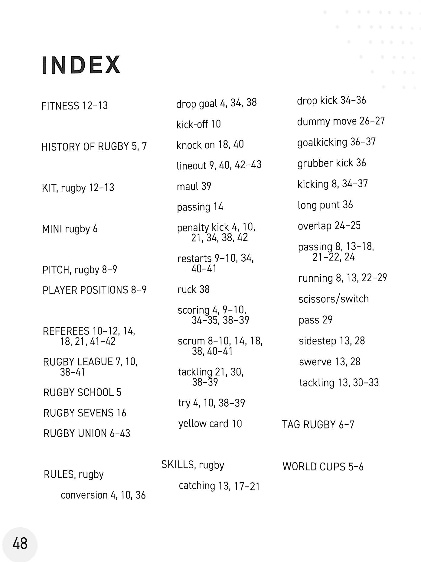 Full of skills tips and illustrations showing key techniques, you'll discover everything you need to know about rugby. The series Sports Academy covers rules, equipment and major competitions through specially commissioned, step-by-step illustrations that clearly shows skills and techniques needed for a sporting children aged 9+.