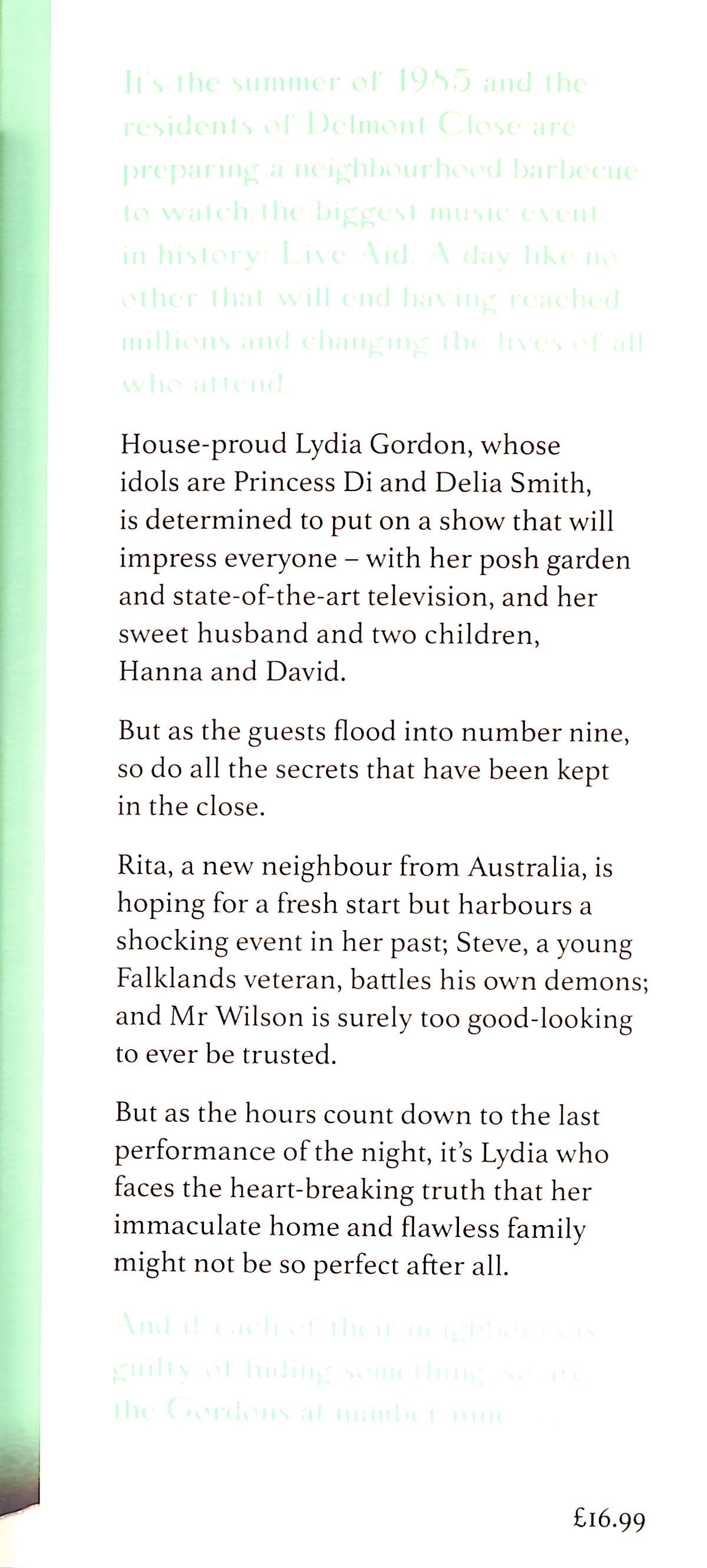 I LOVED it.' MARIAN KEYES‘A beautiful story about secrets, lies and community.’ GRAHAM NORTONFrom the No.1 Sunday Times bestselling author of The List of Suspicious Things ... It's the summer of 1985 and the residents of Delmont Close are preparing a neighbourhood barbecue to watch the biggest music event in history: Live Aid.