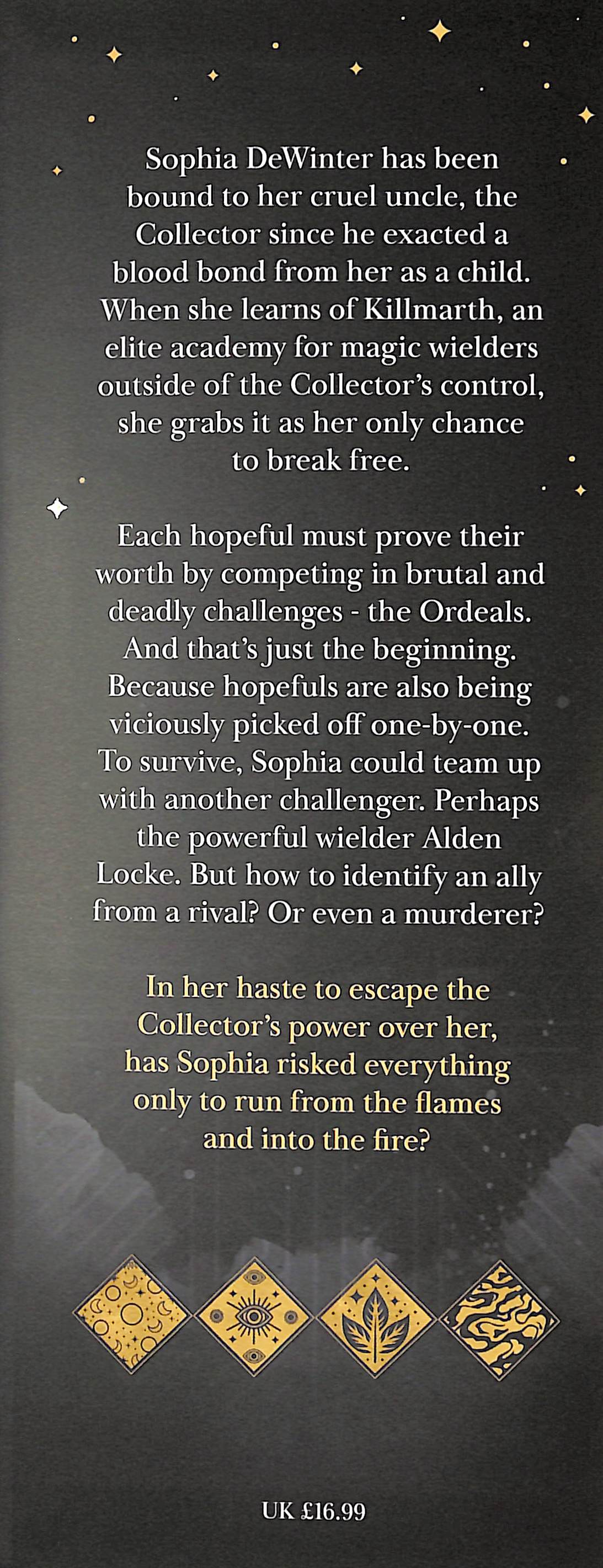 When she learns of Killmarth, an elite academy for magic wielders outside of the Collector’s control, she grabs it as her only chance to break free. Each hopeful must prove their worth by competing in brutal and deadly challenges – the Ordeals. And that’s just the beginning, because hopefuls are also being viciously picked off one-by-one.