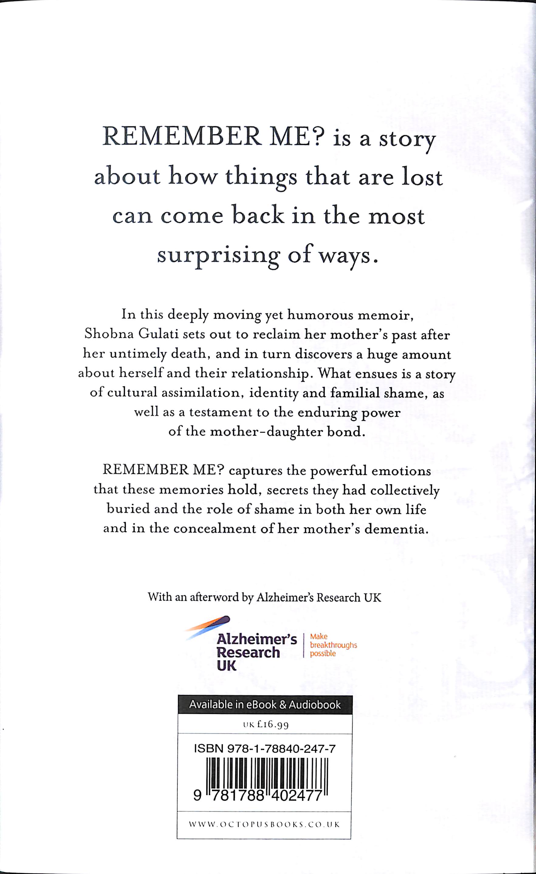 Afterword by Alzheimer's Research UK. 'Shobna Gulati is the Northern heroine of a nation' - Lemn Sissay'Lucid and probing' - Guardian'Wonderful and emotional, a masterpiece of resilience.' - Emma Kennedy Remember Me? is a memoir about caring for a parent with dementia and the memories that resurface in the process.