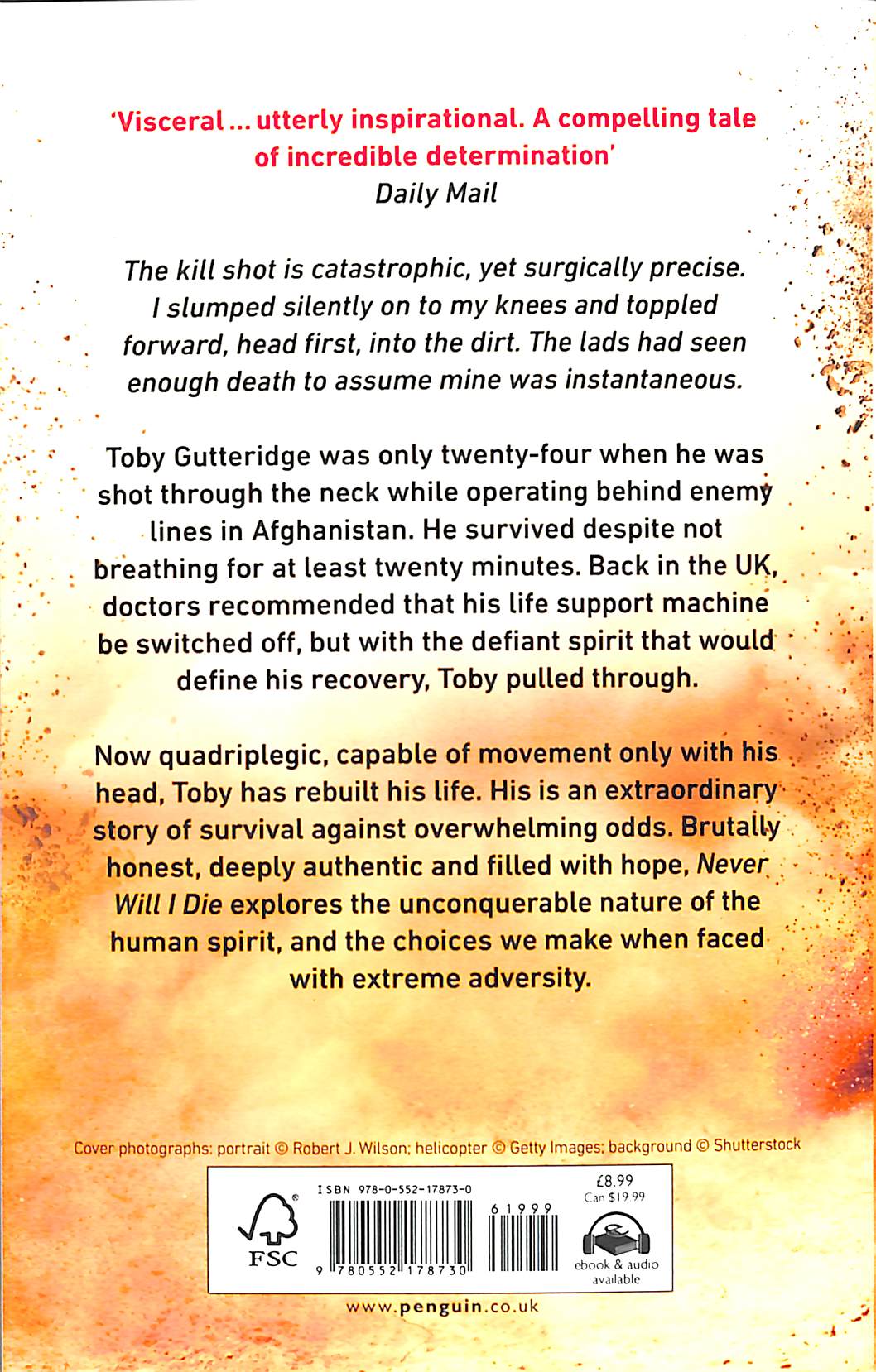 Brutally honest and authentic, he builds a compelling picture of the type of person produced by the Special Forces system, and tells of how one split second changed the course of his life forever. Powerful and inspiring, Never Will I Die is a universal story about our search for purpose, and explores what extreme experience teaches us about what truly matters.