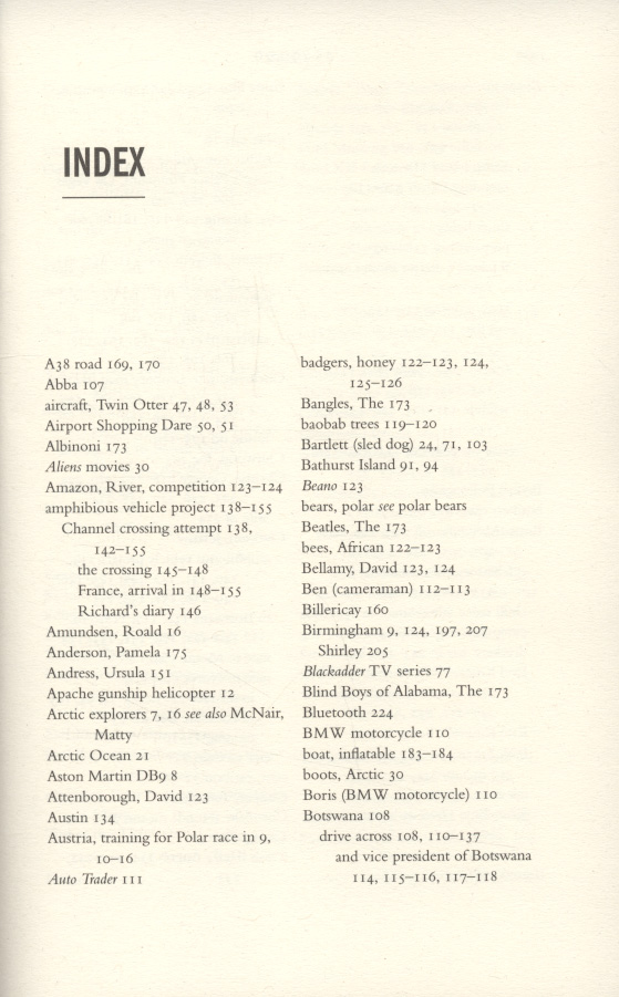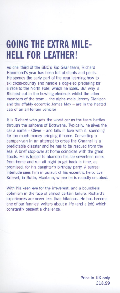 Moving quickly on from the devastating crash that nearly killed him he ranges widely over his life and times: a visit to Glastonbury with James May reminds of him of his early years of playing in a band and how and why he never quite made it as a rock star; the stunts and other perils that come his way like the TopGear North Pole race (why is it Richard who is out in the howling elements in a dog sled whilst the others are in the heated cab of an all-terrain vehicle?), Africa where he falls in love with and repatriates a stray car, and the US (once to be chased by Rednecks in middle America, the other in pursuit of his mad hero Evel Knievel); his passion for cars, what he owns and why and although he loves his wife why it is a toss-up whether he says hello to the wife or the cars first.