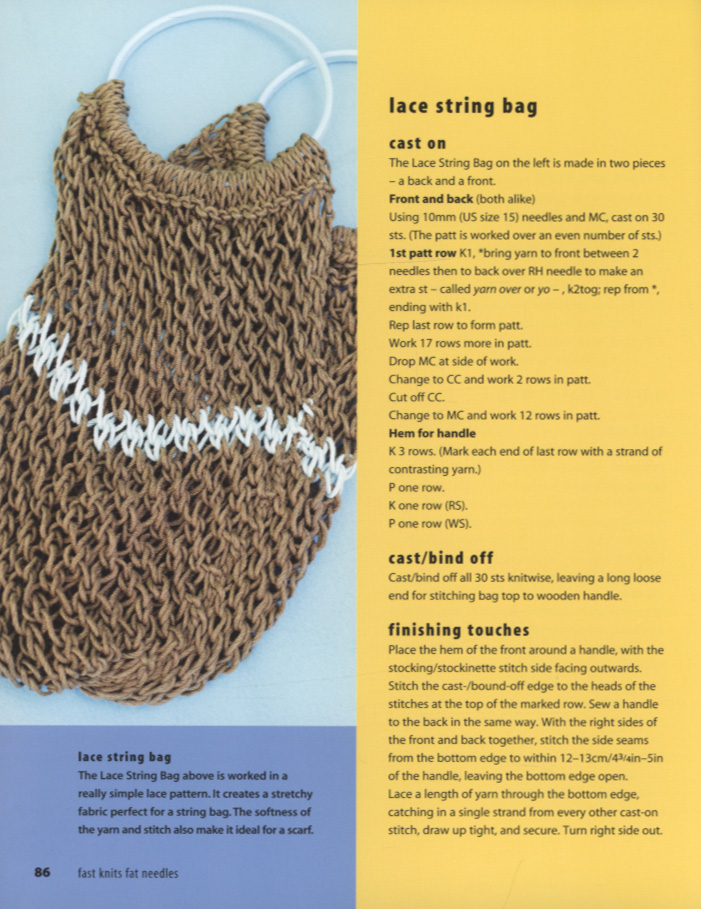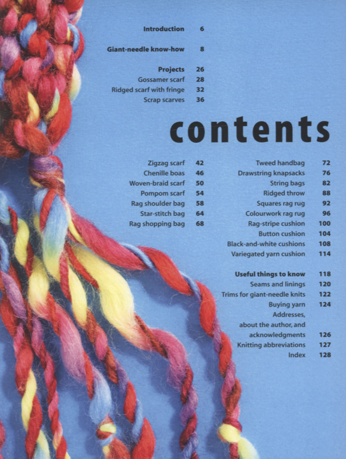 Contents; Giant Needle Know-How 08; Knitting basics 10; Yarns for giant needles 18; Giant-needle textures 22; Knitting with rags 24; Gallery Of Projects 26; Ridged scarf with fringe 28; Woven-thread scarf 32; Scrap scarves 36; Gossamer scarf 40; Zigzag scarf with bead trim 44; Chenille boa collars 48; Pompom rib scarf 52; Strawstring.
