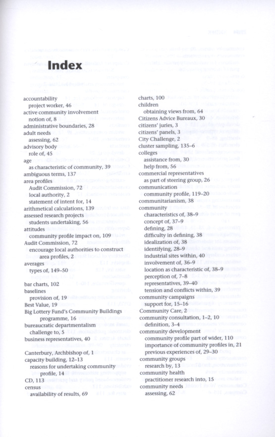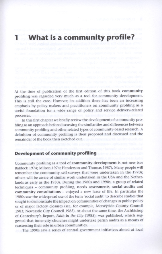 The book begins with consideration of what a community profile is, explores the different reasons why community profiles are undertaken and offers tips for planning research.