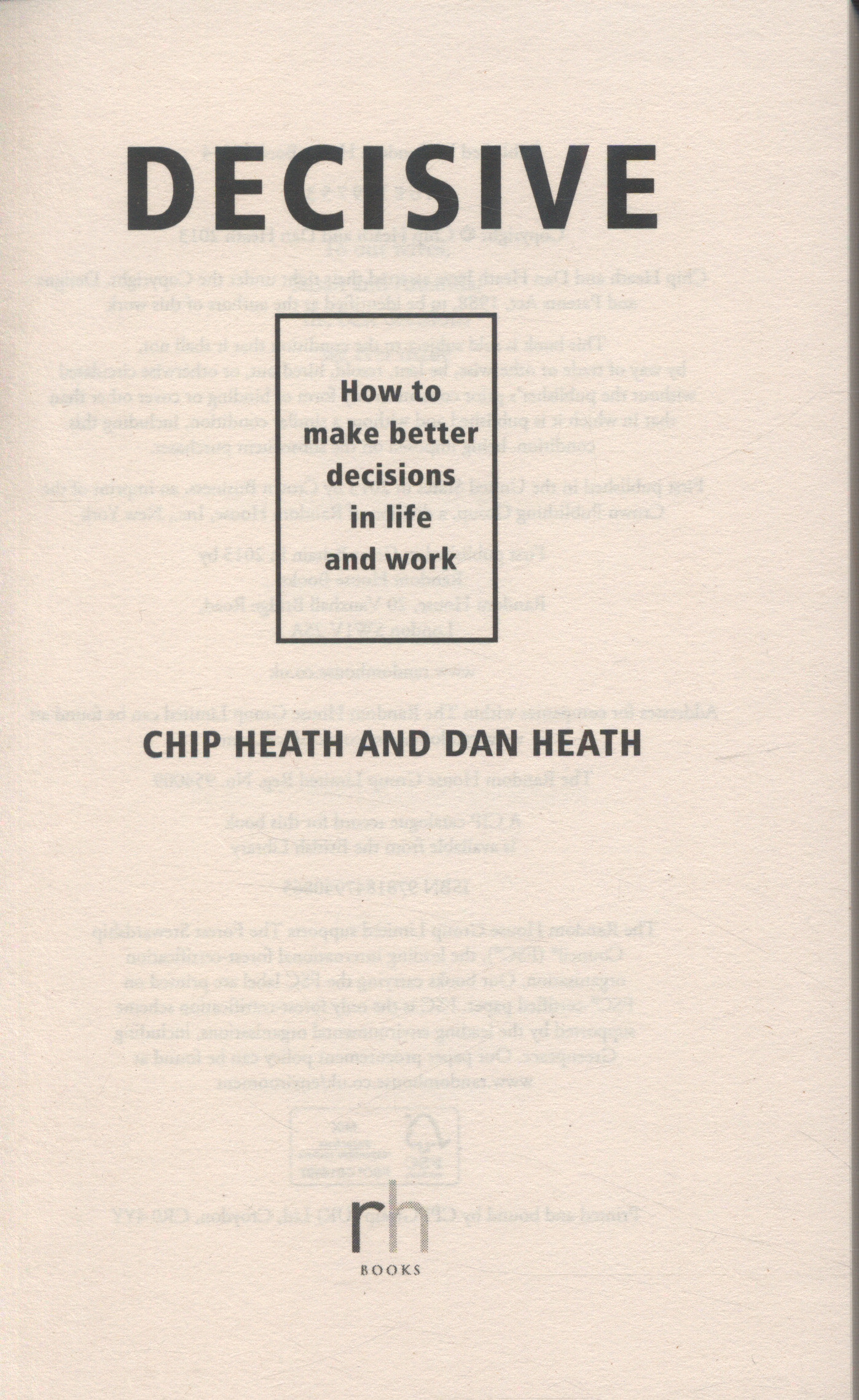 Along the way, they demonstrate how relatively easy it is to avoid the pitfalls and find the best answers. Written in a compulsively readable style, Decisive takes us on a tour from a rock star's ingenious decision-making trick, to a CEO's disastrous acquisition, to a single question that can often resolve thorny personal decisions, in order to offer fresh strategies and practical tools that will enable you to make better choices. Because the right decision, at the right moment, can make all the difference.