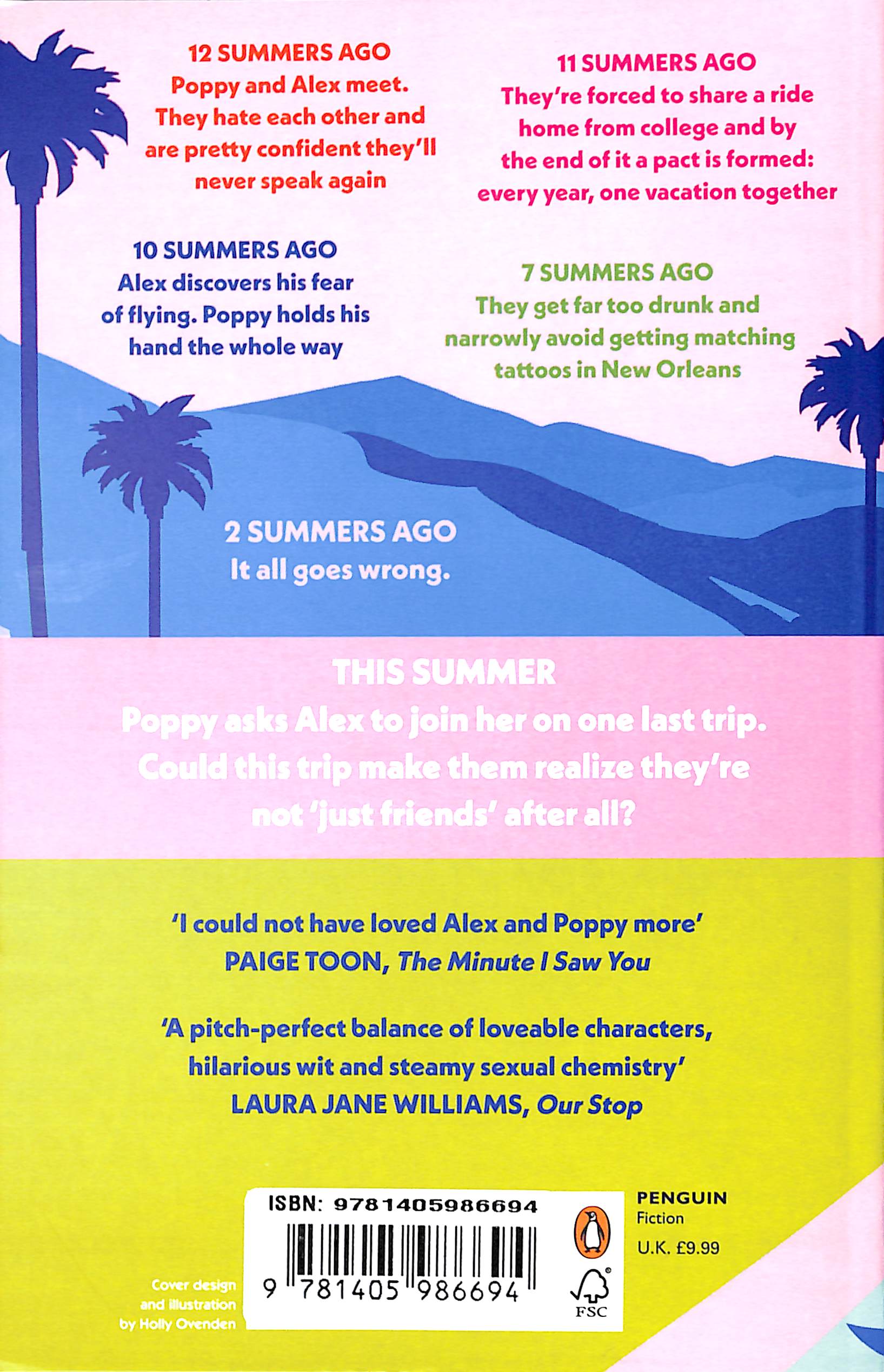 They hate each other, and are pretty confident they'll never speak again. 11 YEARS AGO: They're forced to share a ride home from college and by the end of it a friendship is formed. And a pact: every year, one vacation together. 10 YEARS AGO: Alex discovers his fear of flying on the way to Vancouver. Poppy holds his hand the whole way. 7 YEARS AGO: They get far too drunk and narrowly avoid getting matching tattoos in New Orleans. 2 YEARS AGO: It all goes wrong. THIS YEAR: Poppy asks Alex to join her on one last trip.