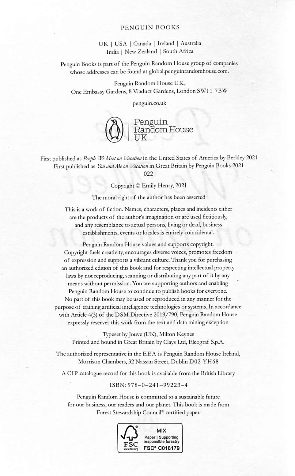 Get ready to travel the world, snort with laughter and - most of all - lose your heart to Poppy and Alex. ** Previously published under the title You and Me on Vacation **------'Our generation's answer to Nora Ephron' Sophie Cousens, This Time Next Year'So warm and funny' Paige Toon, The Minute I Saw You'The hottest book of the summer - the pages simply sizzle!' Josie Silver, One Night on the Island'Emily Henry is my newest automatic-buy author . . . a heartfelt, funny, tender escape that you wish could last forever' Jodi Picoult, Wish You Were Here'A compulsively readable book full of sparkling wit, dazzling prose and a romance that grabbed me by the heart and wouldn't let me go' Abby Jiminez, Part of Your World'Funny, and seriously sizzling' BEST'If whipcrack banter and sexual tension is your catnip, you'll adore this book' Sally Thorne, The Hating Game'What an absolute flipping triumph of a novel!!!