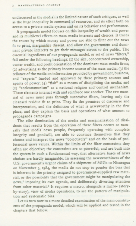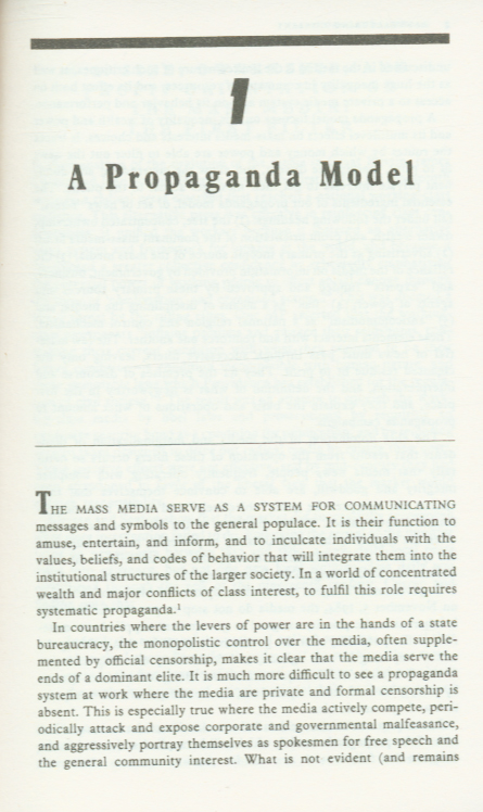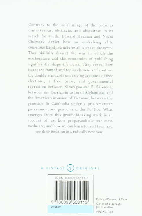 Contrary to the usual image of the press as cantankerous, obstinate, and ubiquitous in its search for truth, Edward Herman and Noam Chomsky depict how an underlying elite consensus largely structures all facets of the news.