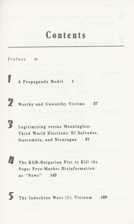 They reveal how issues are framed and topics chosen, and contrast the double standards underlying accounts of free elections, a free press, and governmental repression between Nicaragua and El Salvador; between the Russian invasion of Afghanistan and the American invasion of Vietnam; between the genocide in Cambodia under a pro-American government and genocide under Pol Pot.