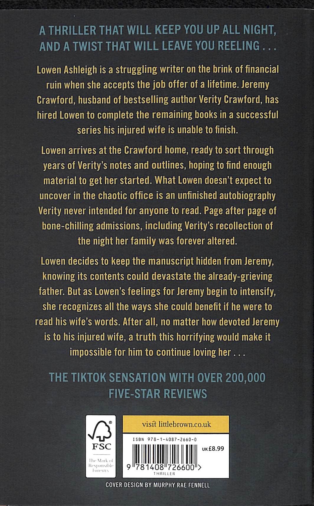 Now, discover her thriller with a twist that will leave you reeling . . . Verity is a global word-of-mouth hit, with over a million five star reviews from readers. Lowen Ashleigh is a struggling writer on the brink of financial ruin when she accepts the job offer of a lifetime.