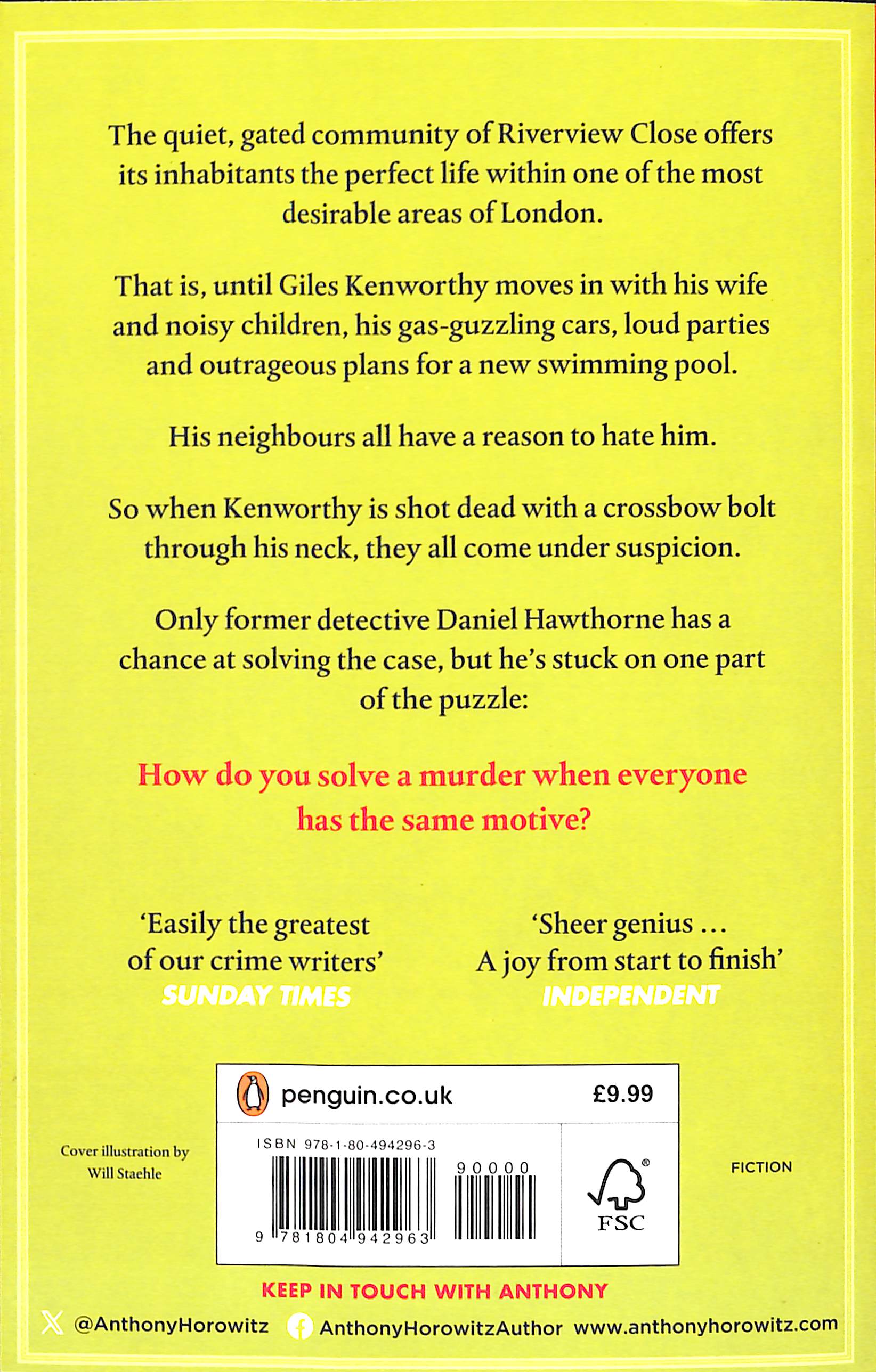 Each one is more inventive than the last' Shari Lapena'Anthony Horowitz is a national treasure’ Ragnar Jónasson _____________Richmond Upon Thames is one of the most desirable areas to live in London. And Riverview Close - a quiet, gated community – seems to offer its inhabitants the perfect life. At least it does until Giles Kenworthy moves in with his wife and noisy children, his four gas-guzzling cars, his loud parties and his plans for a new swimming pool in his garden. His neighbours all have a reason to hate him and are soon up in arms. When Kenworthy is shot dead with a crossbow bolt through his neck, all of them come under suspicion and his murder opens the door to lies, deception and further death. The police are baffled. Reluctantly, they call in former Detective Daniel Hawthorne.