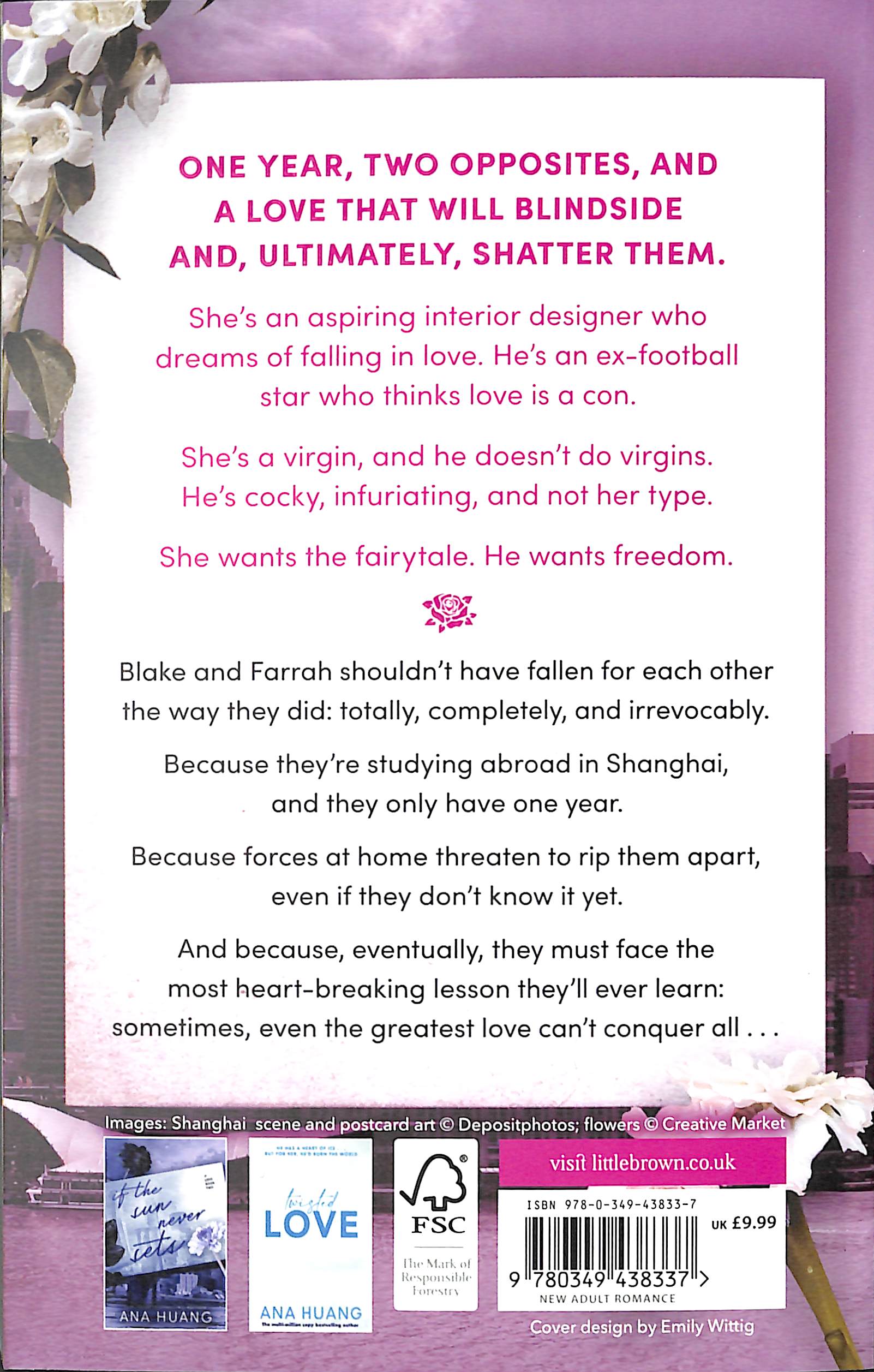 A steamy strangers to friends to lovers romance from Ana Huang, the New York Times bestselling author of the Kings of Sin and Twisted seriesOne year, two opposites, and a love that will blindside and, ultimately, shatter them. She's an aspiring interior designer who dreams of falling in love. He's an ex-football star who thinks love is a con. She's a virgin, and he doesn't do virgins. He's cocky, infuriating, and not her type. She wants the fairytale. He wants freedom. ***Blake and Farrah shouldn't have fallen for each other the way they did: totally, completely, and irrevocably. Because they're studying abroad in Shanghai, and they only have one year. Because forces at home threaten to rip them apart, even if they don't know it yet. And because, eventually, they must face the most heart-breaking lesson they'll ever learn: sometimes, even the greatest love can't conquer all . . . This is the first book in a duet. It's a full-length novel with no sudden cliffhangers, but Blake and Farrah's story concludes in book two, If the Sun Never Sets.