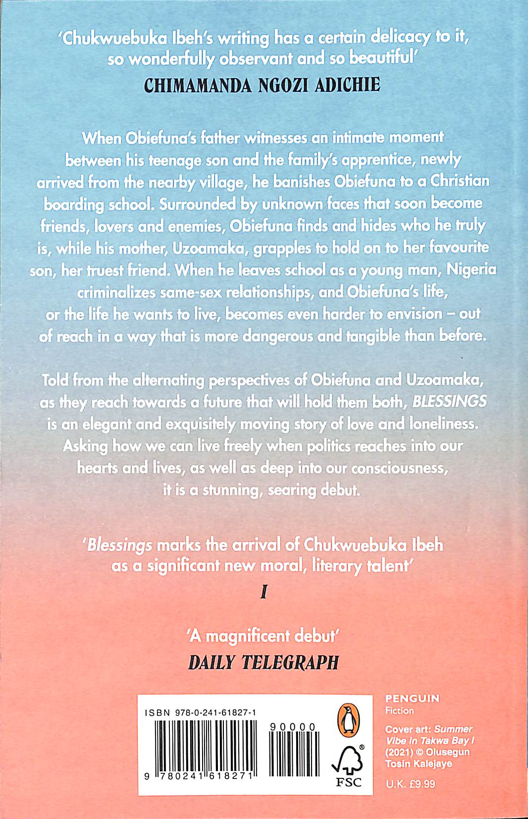 Utterly alienated from the people he loves, Obiefuna begins a journey of self-discovery and blossoming desire, while his mother Uzoamaka grapples to hold onto her favourite son, her truest friend. Interweaving the perspectives of Obiefuna and his mother Uzoamaka, as they reach towards a future that will hold them both, BLESSINGS is an elegant and exquisitely moving story of love and loneliness.