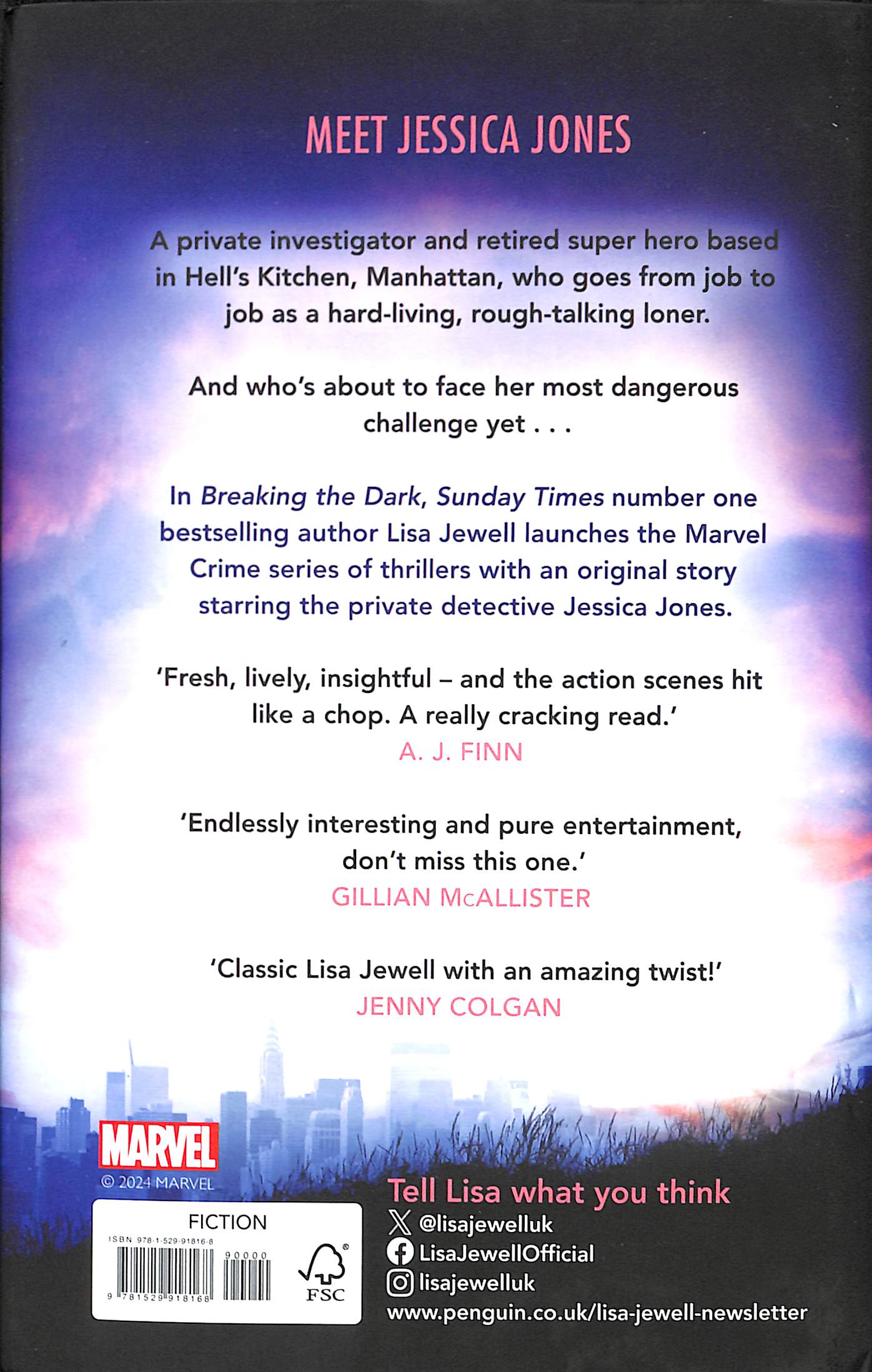What a book. I loved it!'________'Seamlessly integrates superhero lore with the gritty realism of a crime thriller.' Daily Mirror‘A gripping read’ Heat Magazine‘Clever concept, characters and and compelling prose will keep you hooked.’ Woman & Home‘Tricksy, endlessly interesting and pure entertainment, don’t miss this one.' Gillian McAllister‘Fresh, lively, insightful—and the action scenes hit like a chop.' AJ Finn'The perfect blend of psychological thriller and supernatural chiller.' Mark Edwards‘Classic Lisa Jewell with an amazing twist!’ Jenny Colgan'Reveals the depth and complexity of one of the most fascinating and indomitable characters in the Marvel canon.' S.