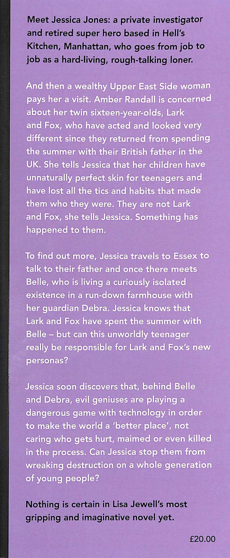 Agatha Christie meets Black Mirror!’ Claire Douglas‘I was hooked from the start and couldn't turn the pages fast enough.’ Alice Feeney‘Absolutely compulsive, complex and gripping.’ Nadine Matheson________Meet Jessica Jones: a private investigator and retired super hero based out of Hell's Kitchen, Manhattan, who goes from job to job as a hard living, rough talking, loner. And then a wealthy Upper East Side woman pays her a visit.