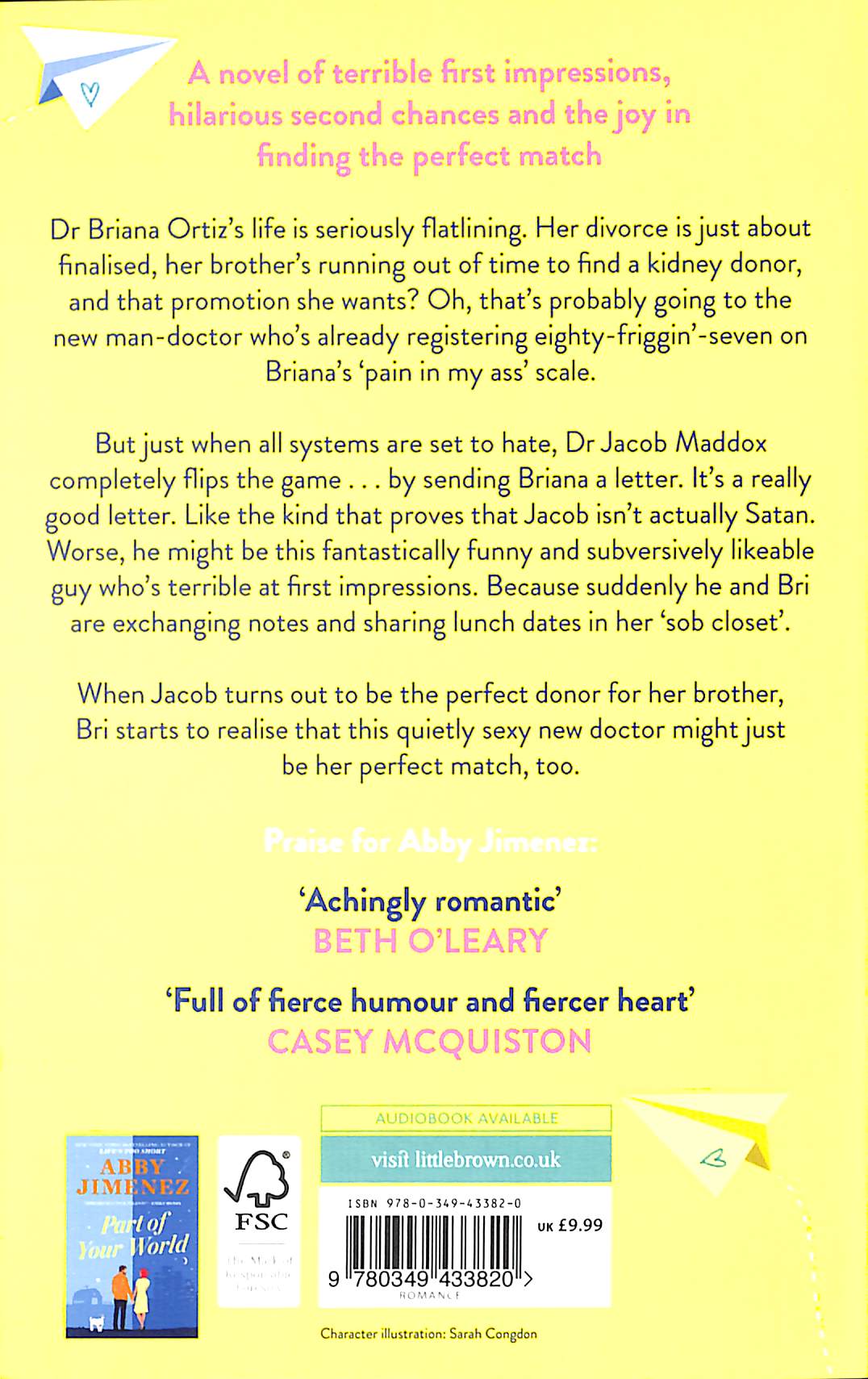 Worse, he might be this fantastically funny and subversively likeable guy who's terrible at first impressions. Because suddenly he and Bri are exchanging letters, sharing lunch dates in her 'sob closet' and discussing the merits of freakishly tiny horses. When Jacob turns out to be the perfect donor for her brother, Bri starts to realise that this quietly sexy new doctor might just be her perfect match, too. .......................... 🌟 DISCOVER WHY READERS LOVE ABBY JIMENEZ . . . 🌟'Sweet and achingly romantic - a truly wonderful love story' BETH O'LEARY'Full of fierce humour and fiercer heart' CASEY MCQUISTON'A deliciously hot, sweet debut.
