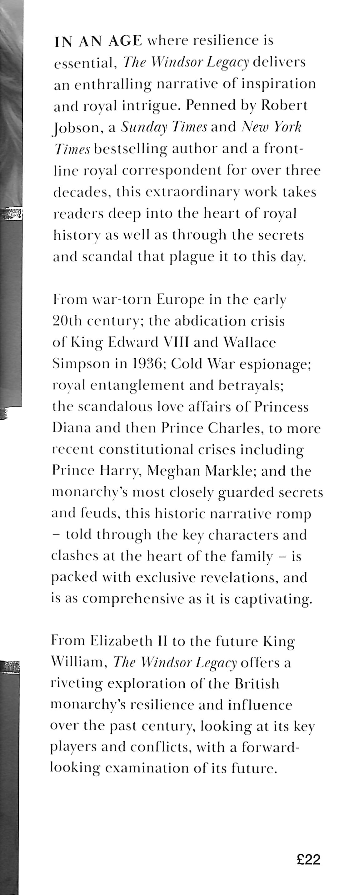 Hidden in their own history are the bombshell secrets the palace hoped would never see the light of day - from the real fallout of the Prince Andrew 'Epstein' scandal, the much-maligned departure of Prince Harry and Meghan Markle and the breakdown of the 'Fab Four', and what the late Queen Elizabeth II thought of it all. In an age where resilience is essential, The Windsor Legacy delivers a scandalous exposé of royal intrigue, jam-packed with exclusive revelations that finally set the record (and the press) straight. With over three decades as a front-line royal correspondent, Jobson offers a jaw-dropping insider account of the abdication crisis, espionage, betrayal, and behind-the-scenes love affairs, to the more recent constitutional crises and the closely guarded truths and feuds that continue to shape the monarchy to this day. Told through key characters who chronicle the clashes at the heart of the family, The Windsor Legacy brings our monarchy's darkest secrets to light, revealing the truths behind the headlines.