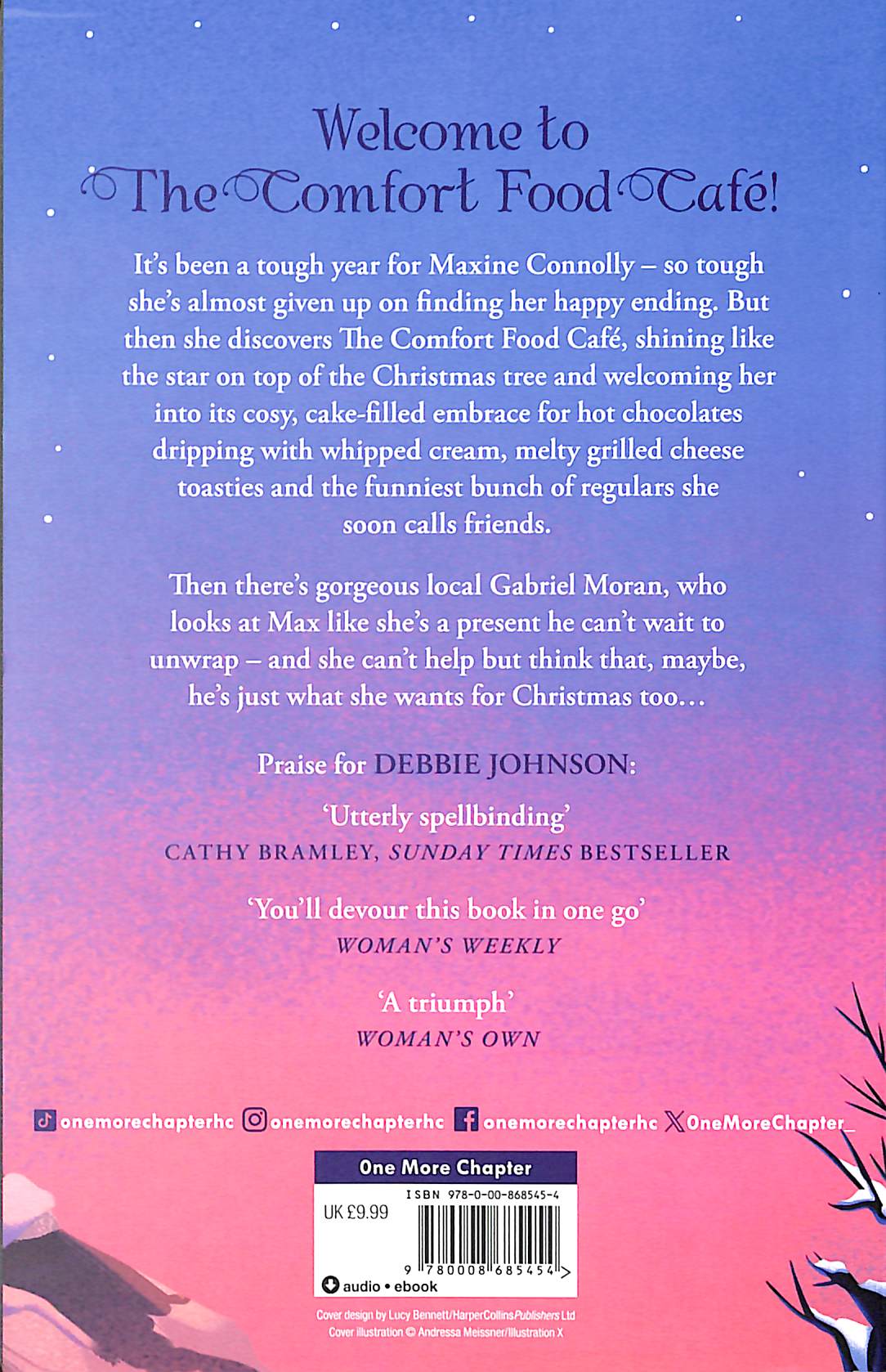 But then she discovers The Comfort Food Café, shining like the star on top of the Christmas tree and welcoming her in to its cozy, cake-filled embrace for hot chocolates dripping with whipped cream, melty grilled cheese toasties and the funniest bunch of regulars she soon calls friends. Then there’s gorgeous local Gabriel Moran, who looks at Max like she’s a present he can’t wait to unwrap – and she can’t help but think that, maybe, he’s just what she wants for Christmas too… Readers ADORE the Comfort Food Café: ‘Spellbinding’ Sunday Times bestseller Cathy Bramley ‘You’ll devour this book in one go’ Woman’s Weekly ‘As cosy as a buttered crumpet’ Sunday Times bestseller Milly Johnson ‘Just my cup of tea’ Bestseller Sue Moorcroft ‘Full of heart and a delight to read’ Award winning author Bella Osborne ‘Full of comfort and cheer – the perfect antidote to cold winter nights’ Sunday Times bestseller Jane Costello ‘Full of quirky characters, friendship and humour, you will devour this engaging and heartwarming novel in one sitting’ Sunday Express