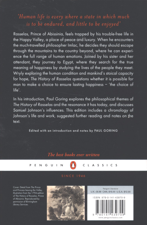 Rasselas, Prince of Abyssinia, leaves the easy life of the Happy Valley, accompanied by his sister Nekayah, her attendant Pekuah, and the much-travelled philosopher Imlac.