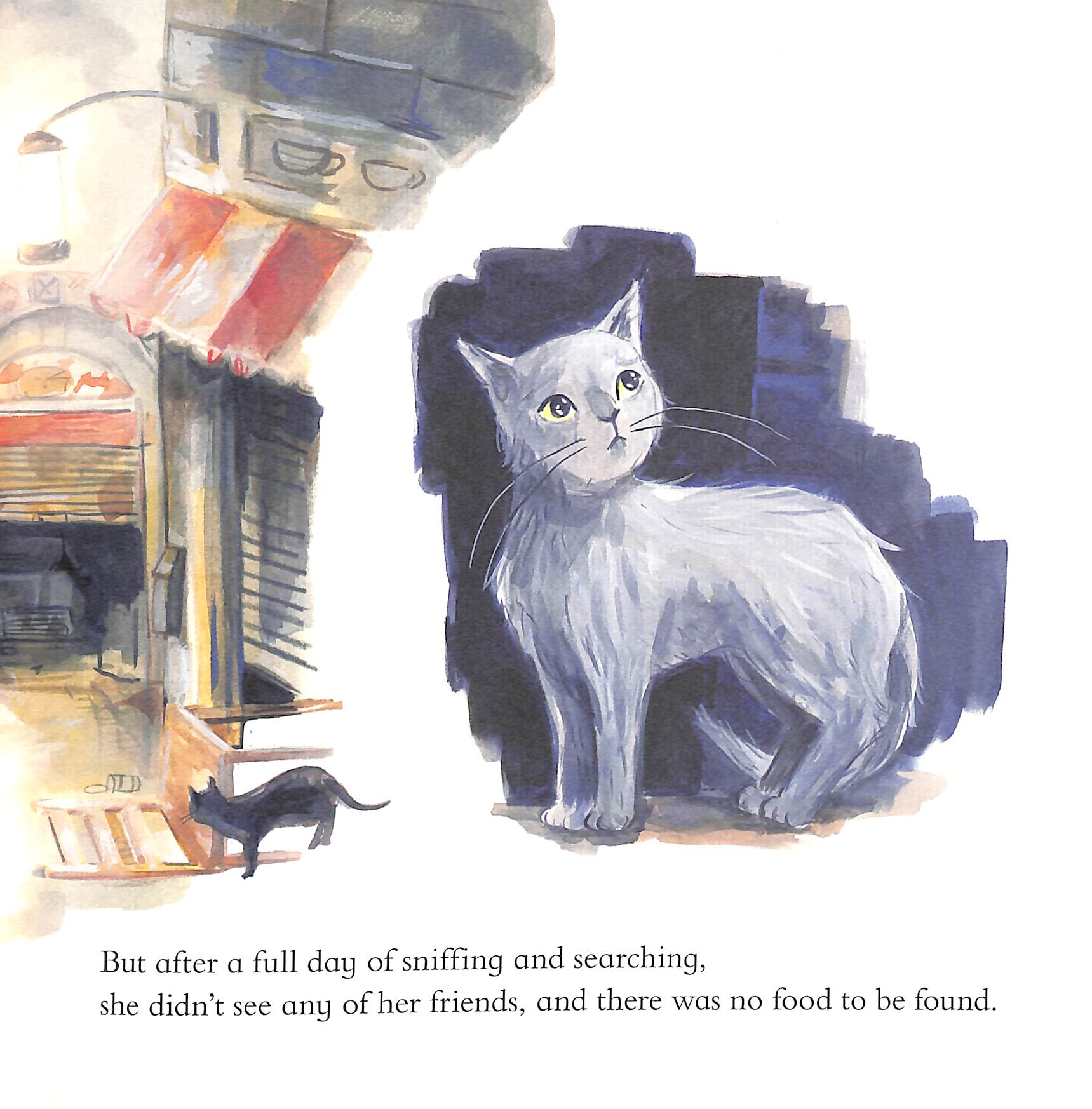 He shows her that kindness is still there when you look for it, and soon the little grey cat knows exactly what to do to made a difference herself.