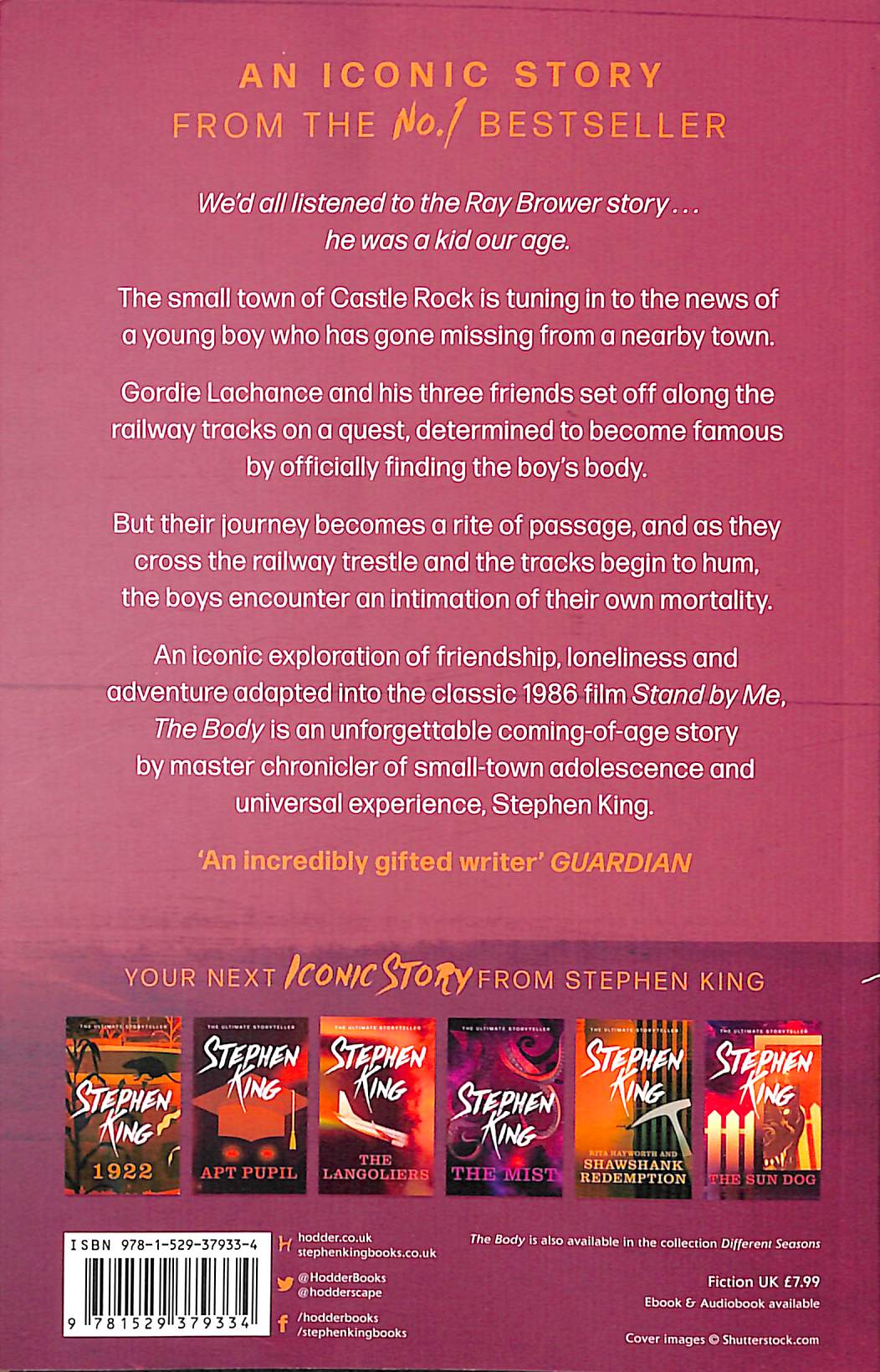 The No. 1 bestselling author Stephen King's timeless coming-of-age novella, The Body - set in Castle Rock and originally published in his 1982 short story collection Different Seasons, and adapted into the film classic Stand by Me - now released as a standalone publication. We'd all listened to the Ray Brower story . . . he was a kid our age The small town of Castle Rock is tuning in to the news of a young boy who has gone missing from a nearby town. Gordie Lachance and his three friends set off along the railway tracks on a quest, determined to become famous by officially finding the boy's body. But their journey becomes a rite of passage, and as they cross the railway trestle and the tracks begin to hum, the boys encounter an intimation of their own mortality. Adapted into the 1986 classic film Stand By Me, The Body is an iconic exploration of friendship, loneliness and adventure, an unforgettable coming-of-age story by master chronicler of small-town adolescence and universal experience, Stephen King.