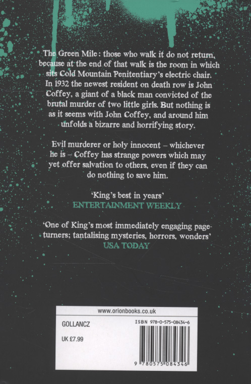 Stephen King's iconic horror masterpiece. An international bestselling and highly acclaimed novel, a must-read for any horror fan, also a hugely successful film starring Tom Hanks. The Green Mile: those who walk it do not return, because at the end of that walk is the room in which sits Cold Mountain penitentiary's electric chair. In 1932 the newest resident on death row is John Coffey, a giant black man convicted of the brutal murder of two little girls.