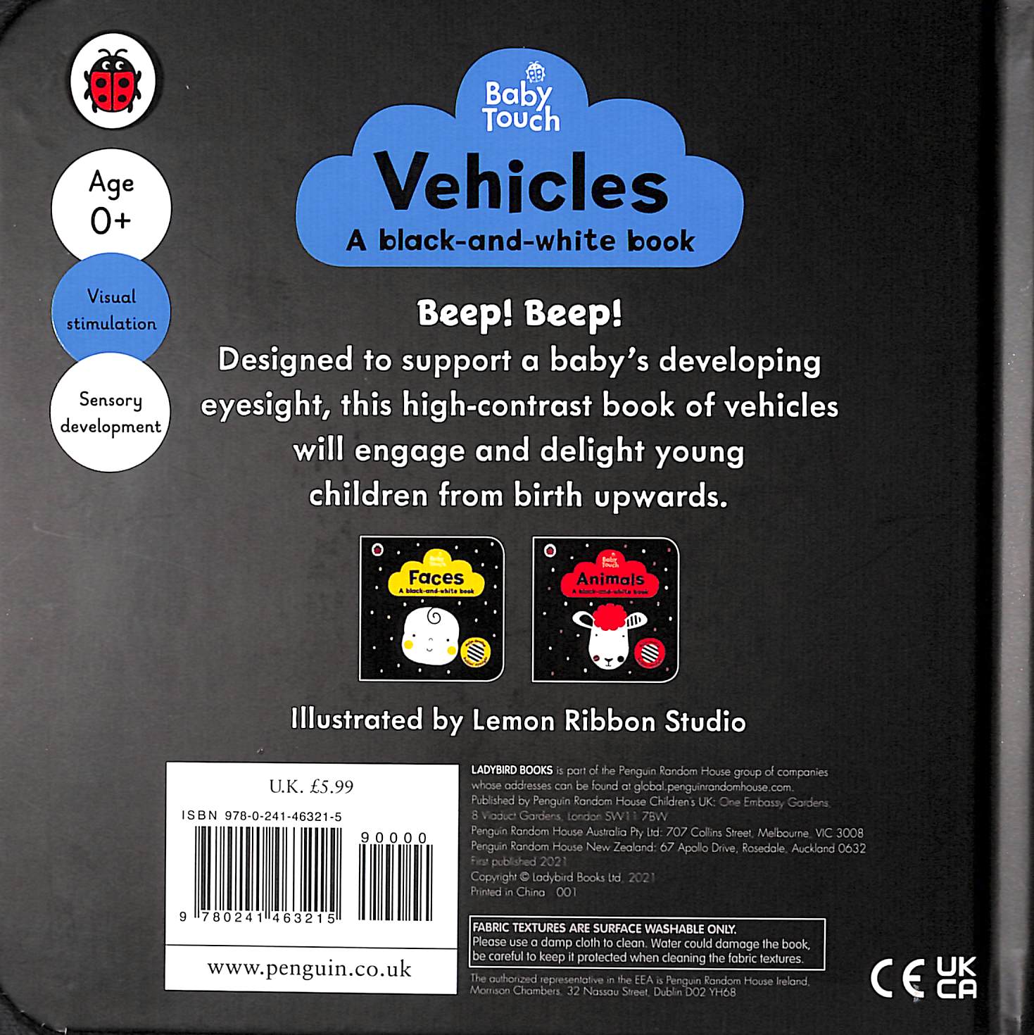 Introduce your baby to all kinds of vehicles with this beautiful black-and-white book!Designed to develop babies' eyesight from birth, this high-contrast book will engage your child's senses as they discover all sorts of vehicles, from boats and diggers, to buses and bicycles. Clearly-defined images will help focus a young child's attention and concentration, and simple text will help build their vocabulary so they can begin to spot vehicles on the go. Say hello to the friendly faces in the car, train and aeroplane - and look out for the surprise touch-and-feel on the final page!This black-and-white book:Stimulates visionEncourages sensory developmentRecommended for children aged 0+Illustrated by Lemon Ribbon StudioAlso available:Baby Touch: Faces: a black-and-white bookBaby Touch: Animals: a black-and-white bookBaby Touch: My First Book: a black-and-white cloth bookBaby Touch: A black-and-white buggy book