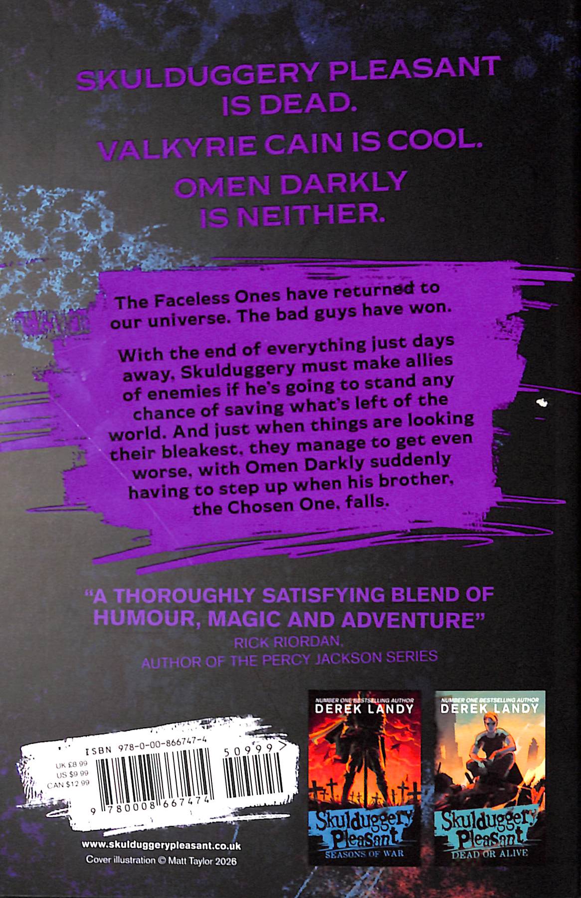 The bad guys have won. With the end of everything just days away – and no longer able to rely on Valkyrie Cain – Skulduggery must make allies of enemies if he's going to stand any chance of saving what's left of the world. And just when things are looking their bleakest, they manage to get even worse, with Omen Darkly suddenly having to step up when his brother, the Chosen One, falls. There's a lot going on. Most of it is bad. Sorry about that.