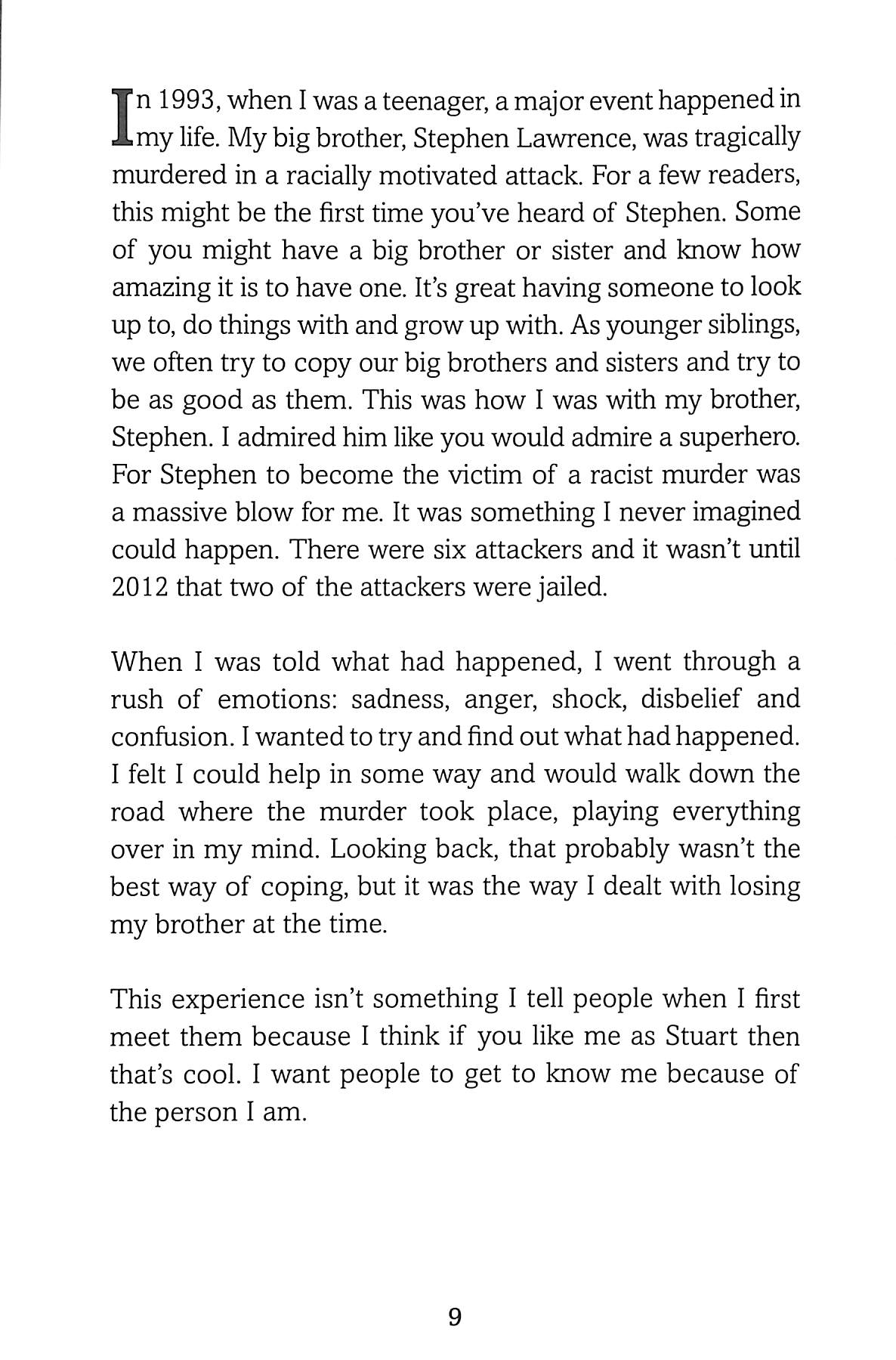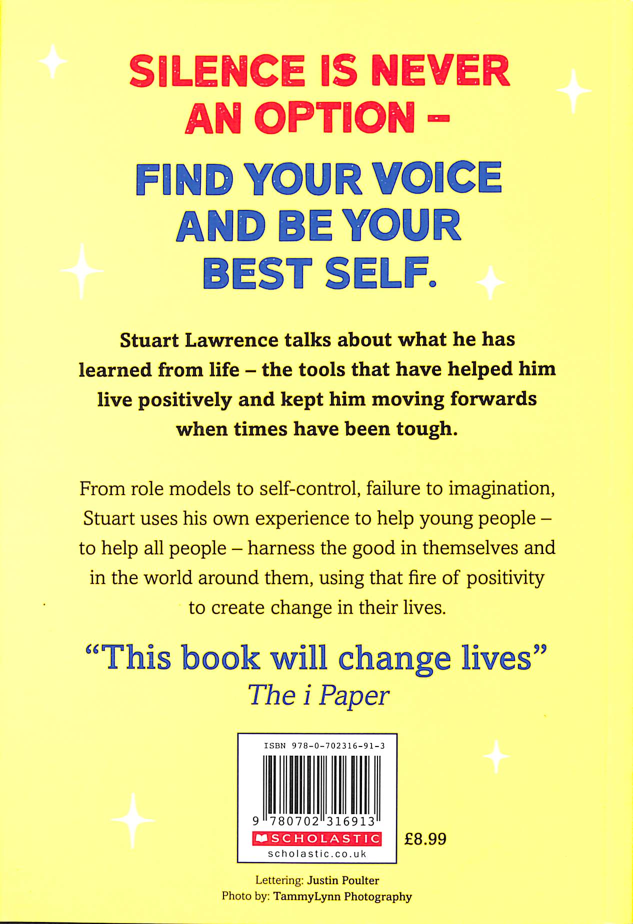 Silence is NEVER an option – find your voice and be your best self. “This book will change lives” – Marianne Levy, the i Paper In this book, Stuart Lawrence talks about what he has learned from life – the tools that have helped him live positively and kept him moving forwards when times have been tough. “We all want to be successful in life and to be remembered for our achievements – but how can we do that, when the world can seem so big and sometimes scary?”– Stuart Lawrence “The publication of his first book for children, Silence is Not an Option: You Can Impact the World for Change, is intended to empower all children irrespective of skin colour to demand a better society… Stephen Lawrence’s brightness runs throughout the pages, along with Stuart’s love for his brother” – Louise Carpenter, The Times Magazine From role models to self-control, failure to imagination, Stuart’s aim with this book is to use his own experience to help young people – to help all people – harness the good in themselves and in the world around them, using that fire of positivity to create change in their lives. an illuminating guide for approaching life with positivity and wisdom simple tips for rewarding everyday practices  bold page layouts that are stimulating and clear to read  About the author: Stuart Lawrence is the younger brother of Stephen Lawrence, the young man who, on 22 April 1993, at the age of just 18, was murdered in an unprovoked racist attack.