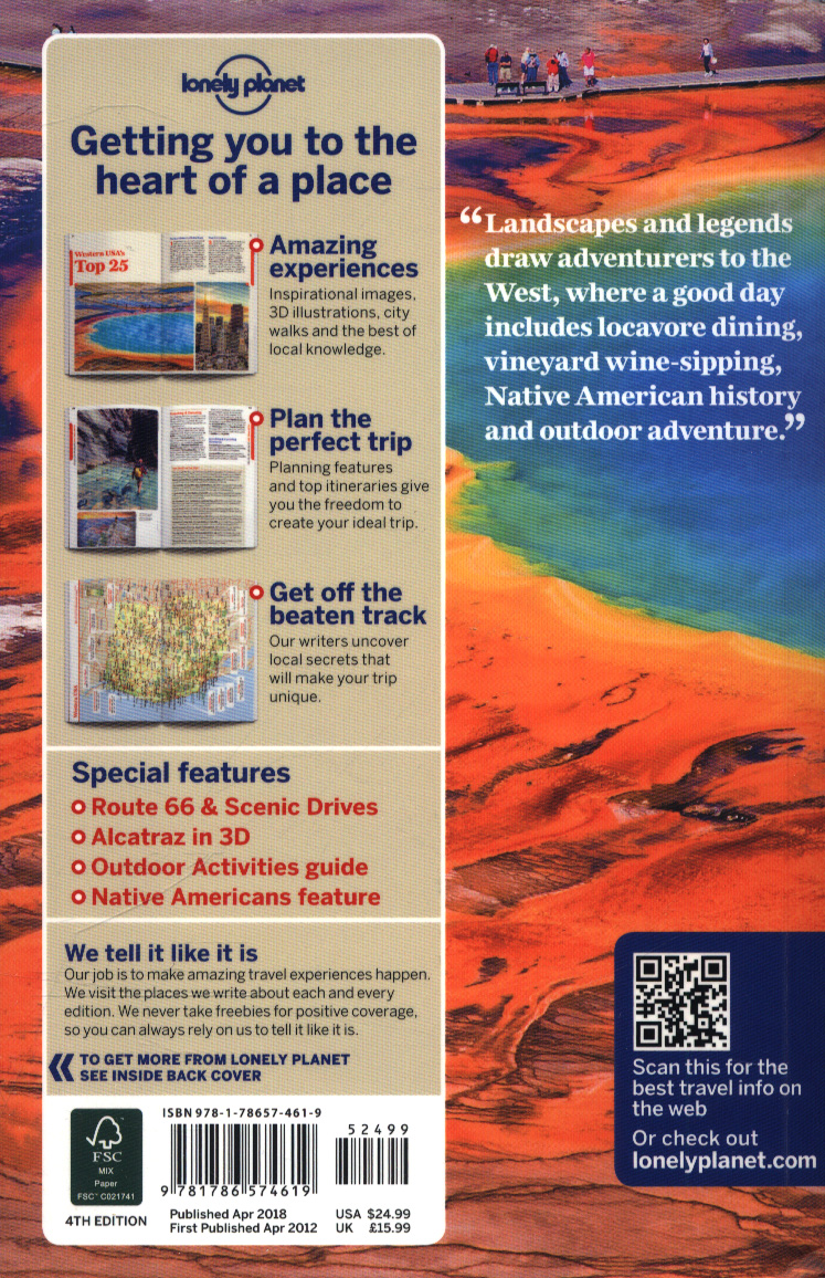 Inside Lonely Planet Western USA Travel Guide: Colour maps and images throughoutHighlights and itineraries help you tailor your trip to your personal needs and interestsInsider tips to save time and money and get around like a local, avoiding crowds and trouble spotsEssential info at your fingertips - hours of operation, phone numbers, websites, transit tips, pricesHonest reviews for all budgets - eating, sleeping, sight-seeing, going out, shopping, hidden gems that most guidebooks missCultural insights give you a richer, more rewarding travel experience - history, Native American culture, arts, architecture, environment, wildlifeCovers California, Los Angeles, San Francisco, Pacific Northwest, Washington, Oregon, Rocky Mountains, Colorado, Southwest, Las Vegas, Arizona and more The Perfect Choice: Lonely Planet Western USA, our most comprehensive guide to Western USA, is perfect for both exploring top sights and taking roads less traveled. About Lonely Planet: Lonely Planet is a leading travel media company and the world's number one travel guidebook brand, providing both inspiring and trustworthy information for every kind of traveller since 1973.