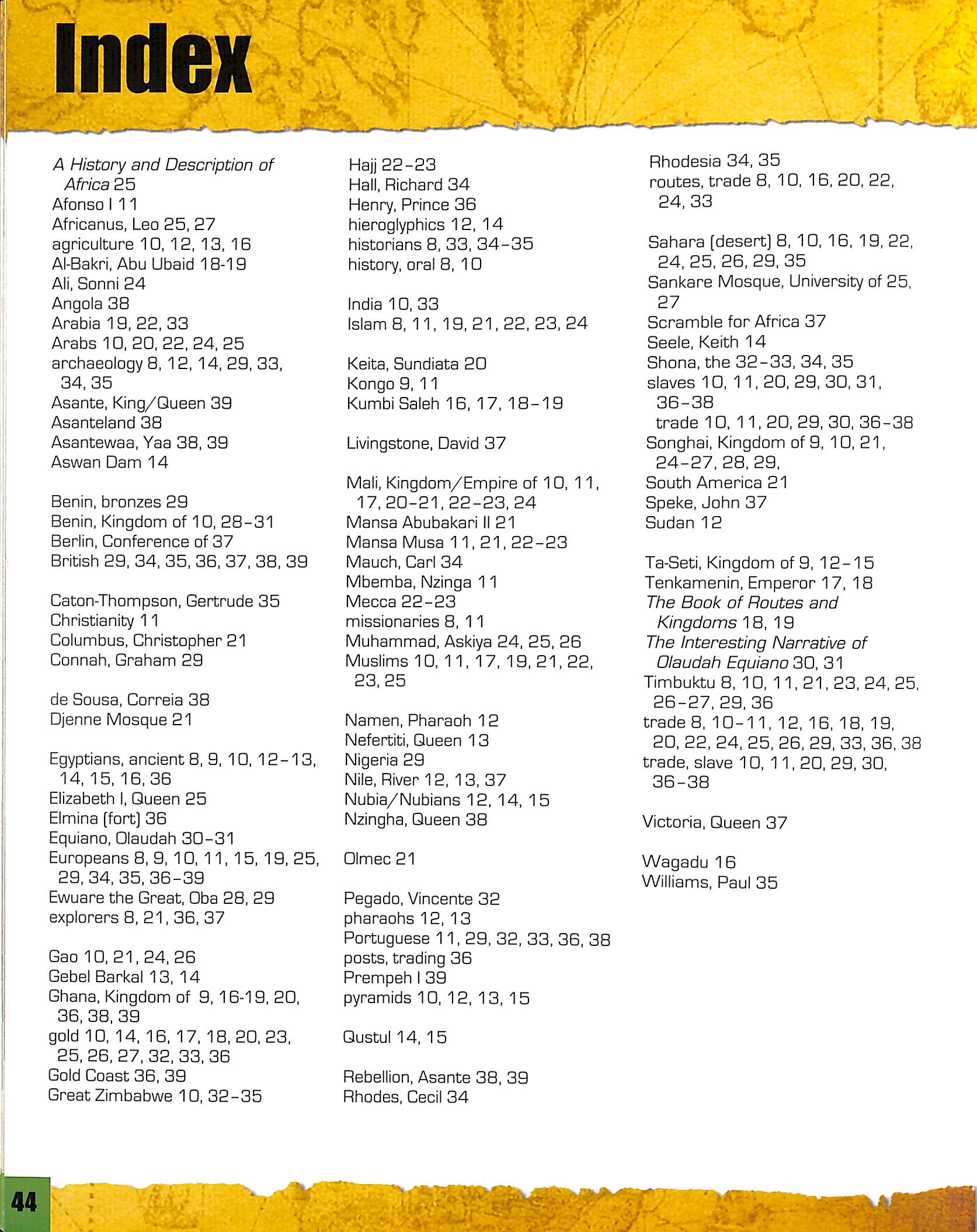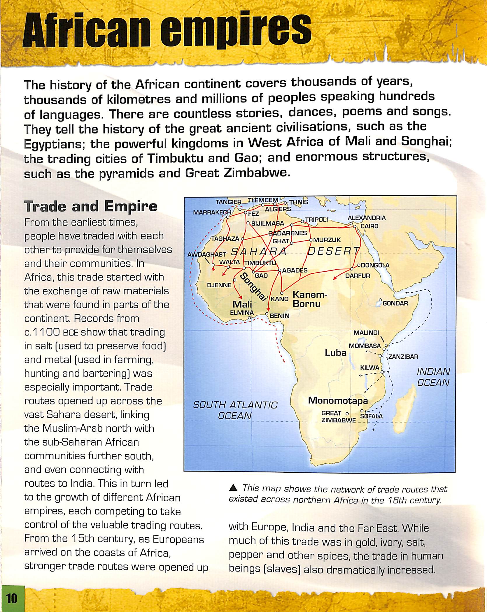 They tell the history of the great ancient civilisations, such as the Egyptians; the powerful kingdoms in West Africa of Mali and Songhai; the trading cities of Timbuktu and Gao; and enormous structures, such as the pyramids and Great Zimbabwe.