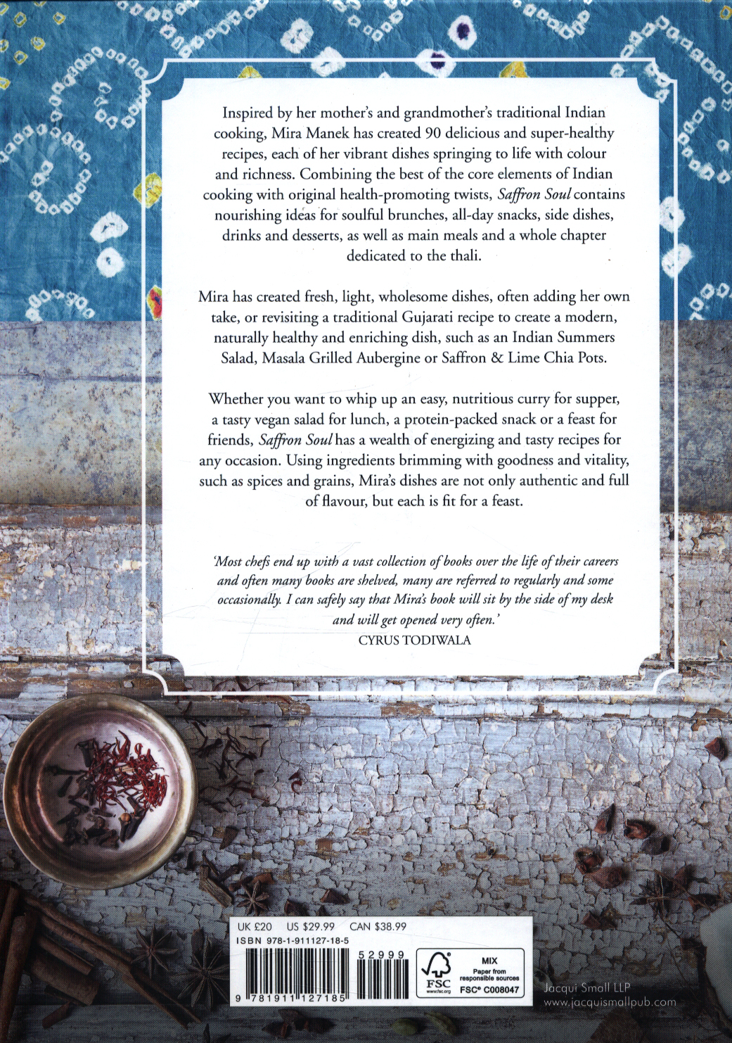 Whether you want to cook a Saffron & Lime Chia Pot, an Indian Summer Salad, a Thali, a Masala Almond Milk or a Mango Shrikhand Cheesecake, Saffron Soul combines the best of the core elements of Indian cooking with original health-promoting twists. As well as offering the best and most naturally healthy Gujarati recipes, Mira also recreates some perennial favourites, replacing traditionally used grains and sugar with more nutritious ingredients such as millet, chia and jaggery, and cutting down on oils and fats, to make her dishes even healthier. hether cooking a filling spicy curry, a soulful brunch, a nutritious light meal or a luscious dessert, Mira's dishes vibrantly burst with colour and a richness of flavour and spice, each fit for a feast.