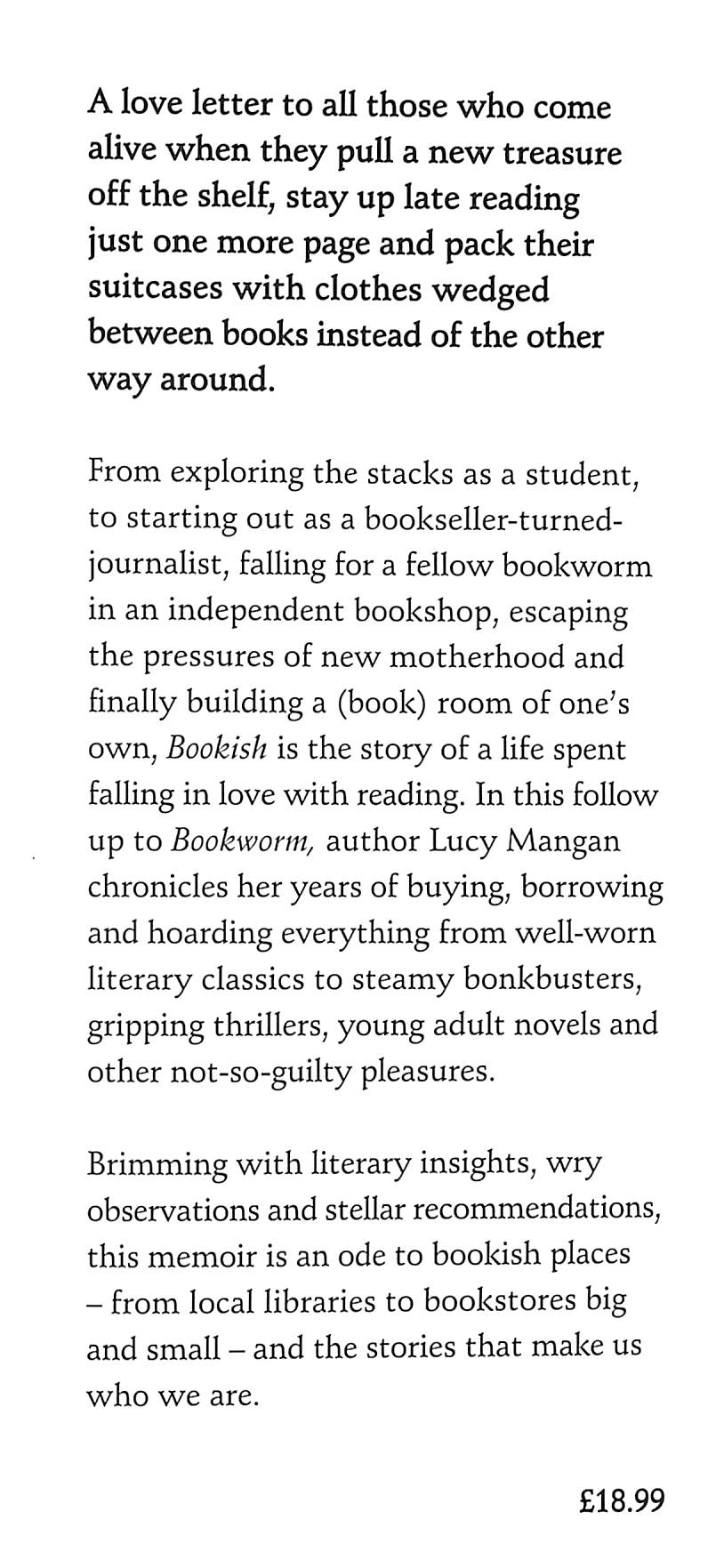 'A bookworm's delight' Sara Collins | 'A gorgeous hug of a book – funny, warm and charming' Marian Keyes | 'Comforting, funny and moving' Sali Hughes | 'Lucy Mangan on books is like butter on toast: perfect' Caitlin Moran | [Mangan] makes for a wonderfully incisive critic' ObserverA love letter to all those who come alive when they pull a new treasure off the shelf, stay up late reading just one more page and pack their suitcases with clothes wedged between books instead of the other way around. From exploring the stacks as a student, to finding her feet as a bookseller-turned-journalist, falling for a fellow bookworm in an independent bookshop, escaping the doldrums of new motherhood and finally building a (book) room of her own, Bookish is the story of a life spent falling in love with reading.